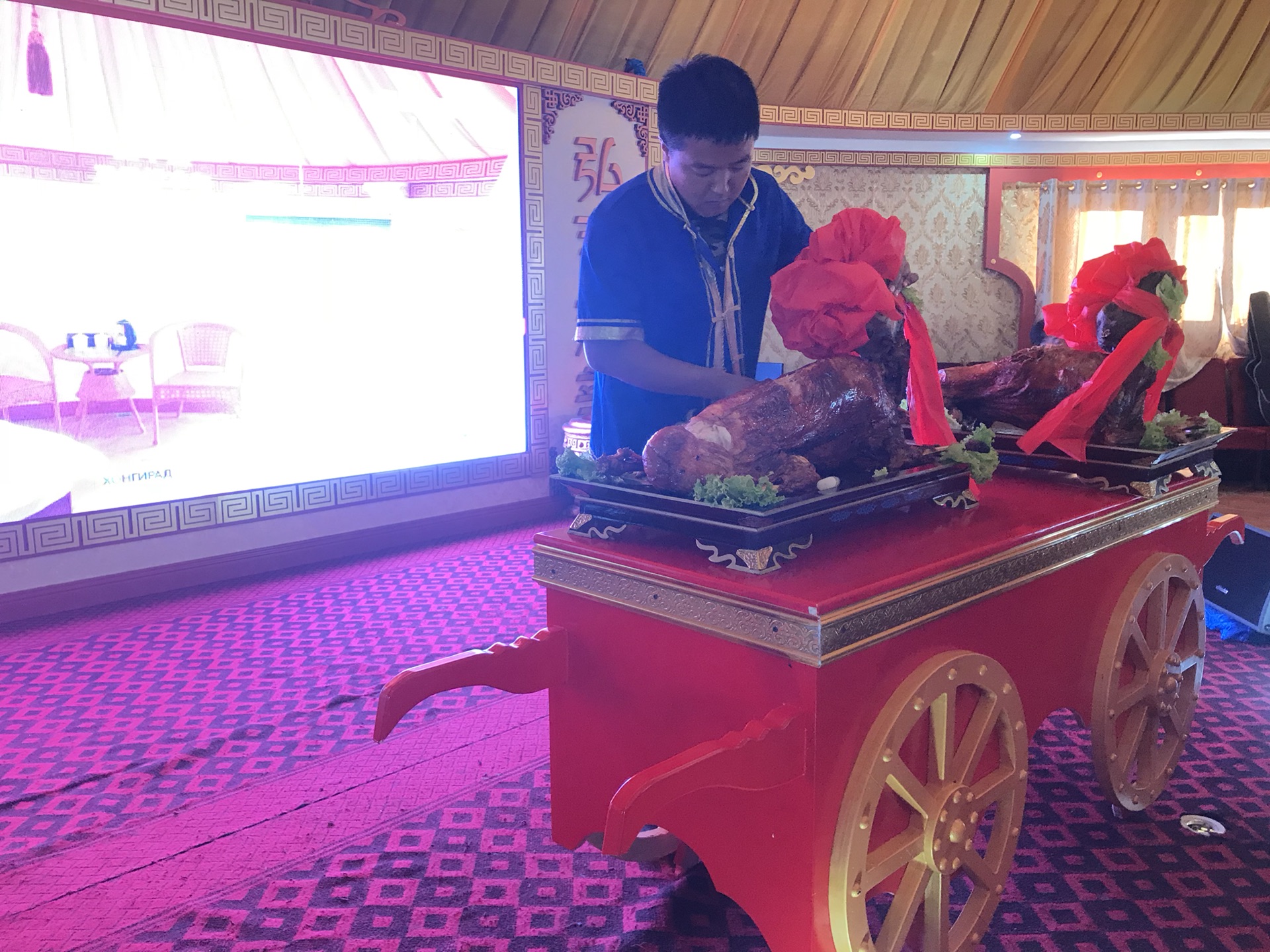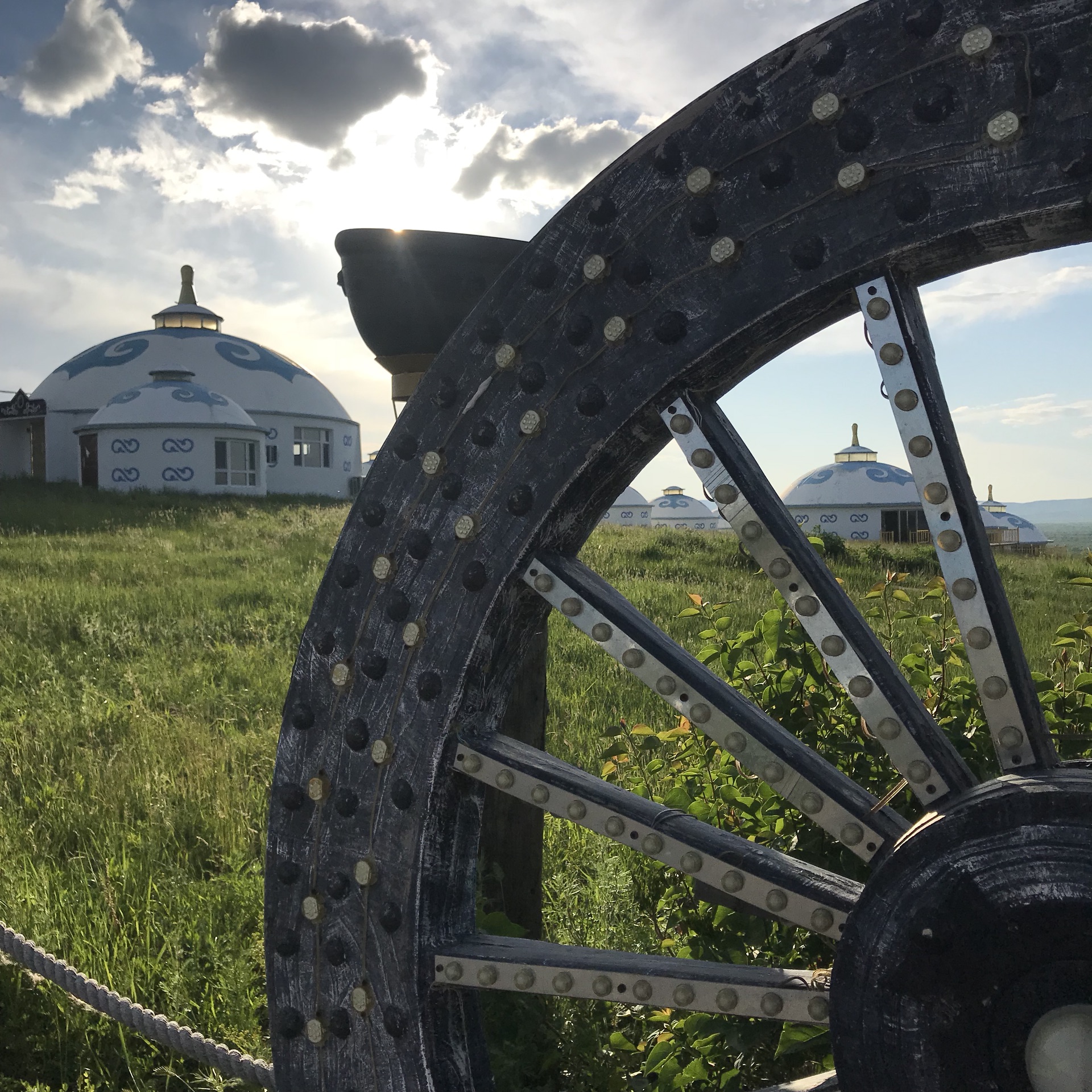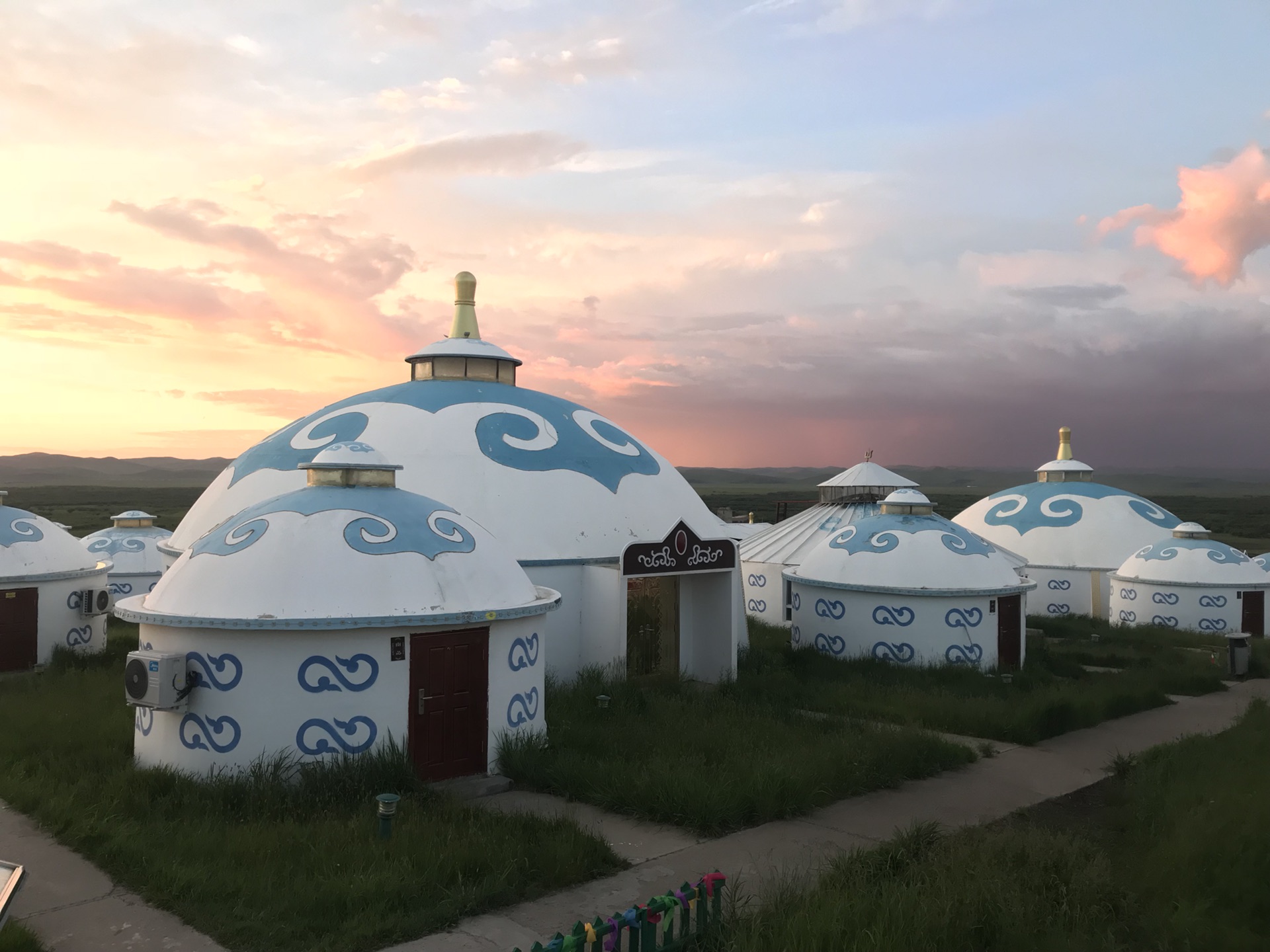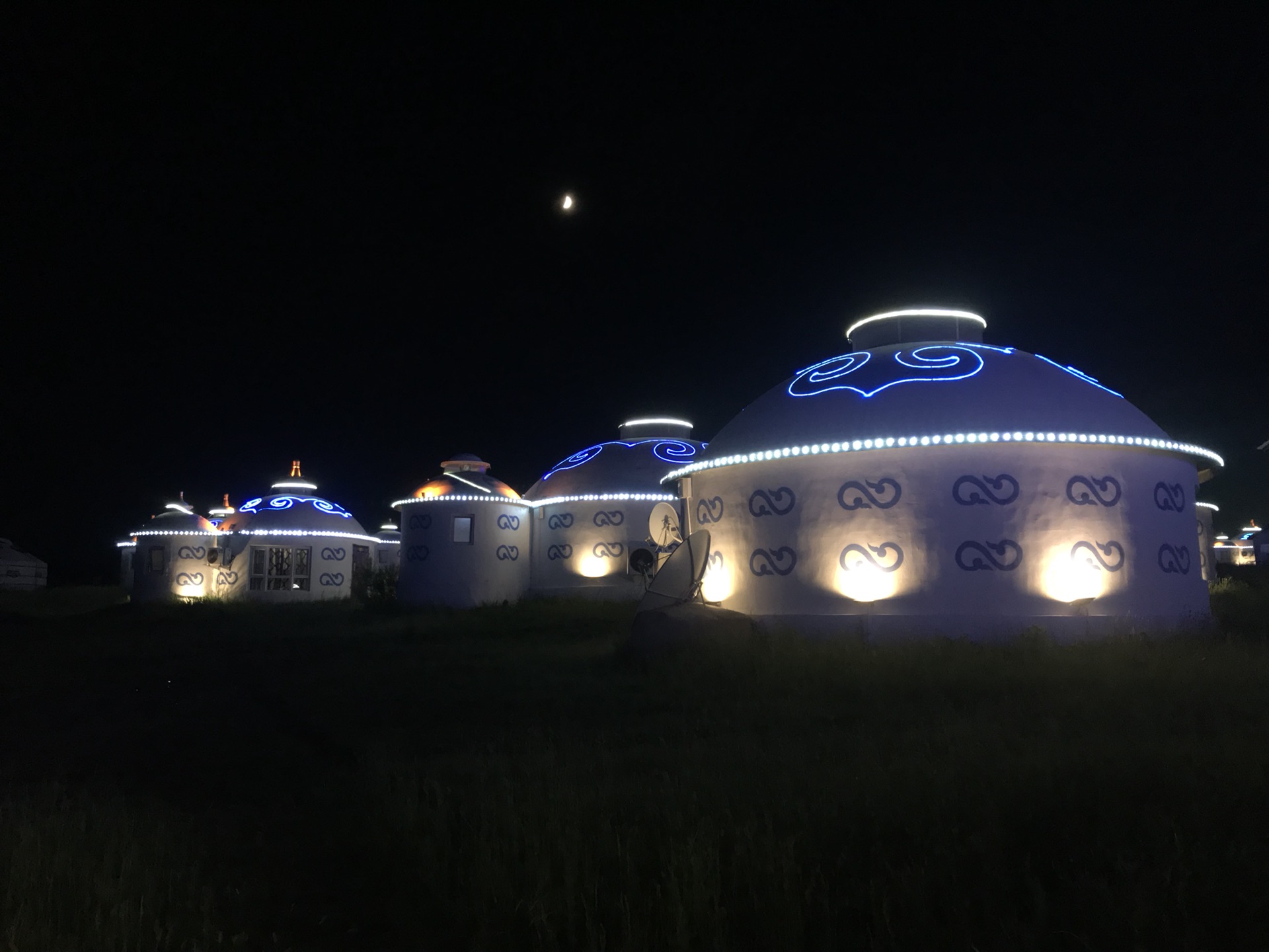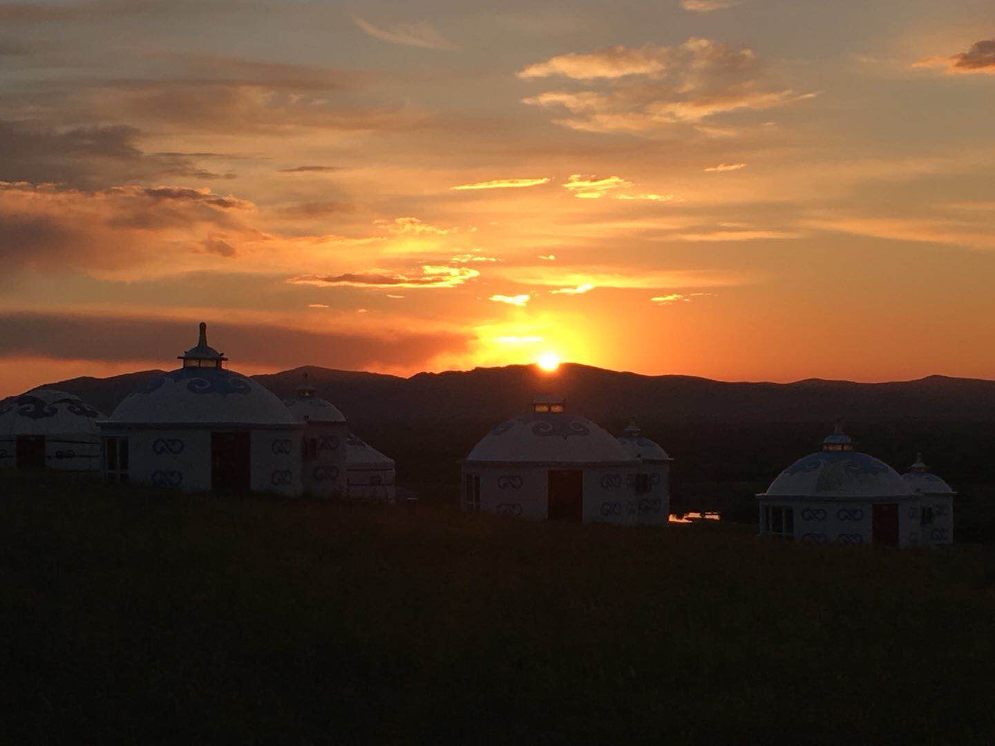 晚上看表演,吃烤羊腿,我一直不喜欢这样的场合,但是也感受一下吧,导游又骗我们,他说今天晚上表演唱歌的呢,唱歌呢?吃完出来正好是日落,草原的日落真的漂亮,火烧云印红了一片天空,蒙古包在这样的背景下,也特别有感觉。再晚一些,亮灯的蒙古包,就像草原上的精灵,来呼伦贝尔,必须有这样的体验,必须体验下篝火晚会,一群人傻乎乎的围着篝火跳舞,挺有意思的。只是这次没有看到漫天的星空,但是总要留一些东西下次来看把。