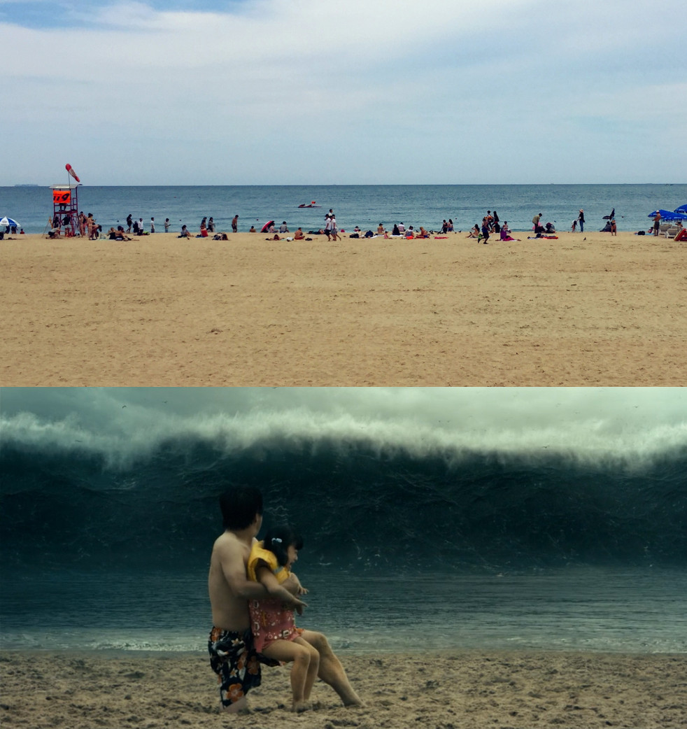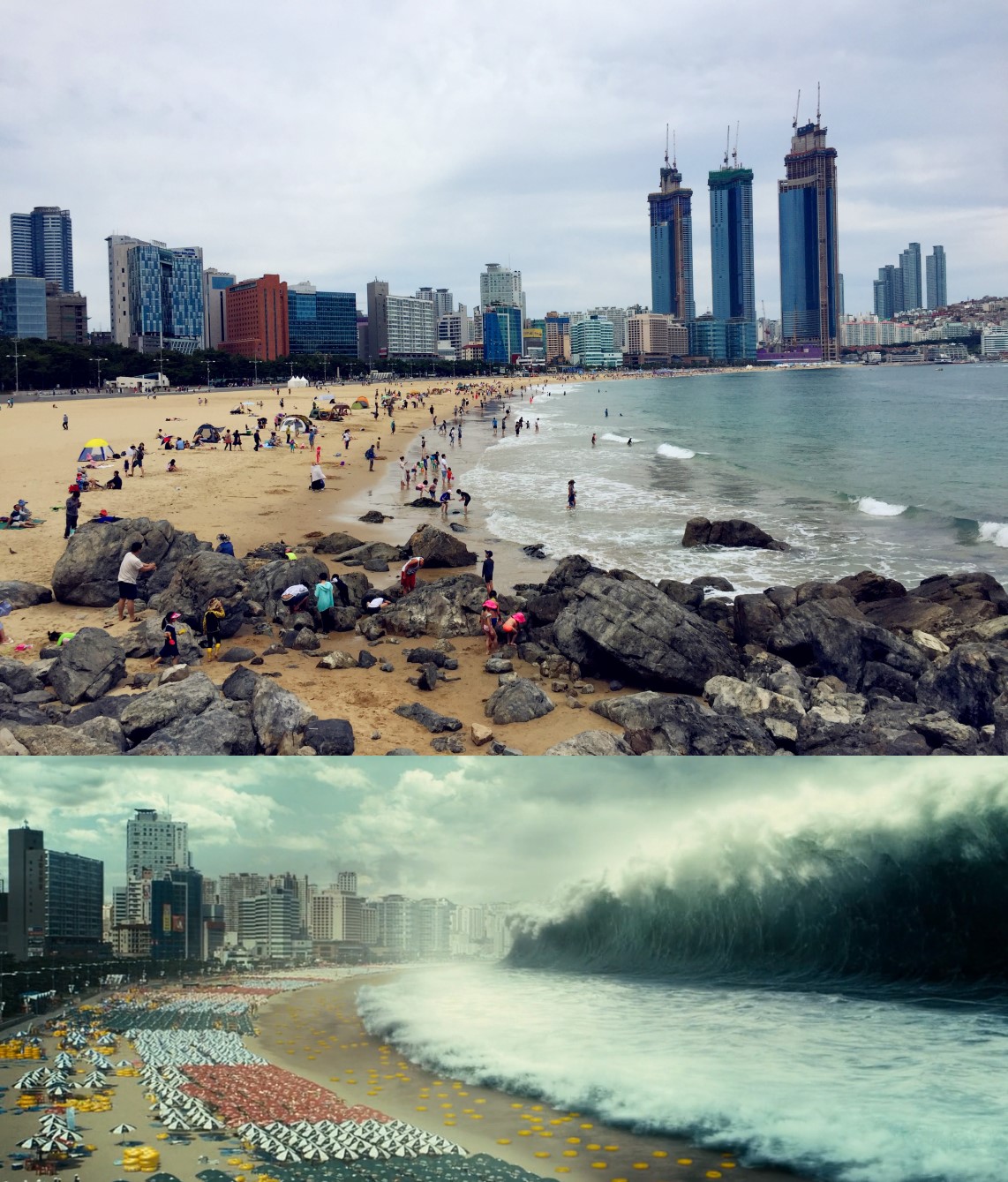 电影里,在灾难降临前,大人小孩同乐于海云台的情景与我眼前所见无异。于是在我心中暗暗觉得海云台随时会像电影里一样,海啸即将倾泻而来,看来我是受电影影响太大了。