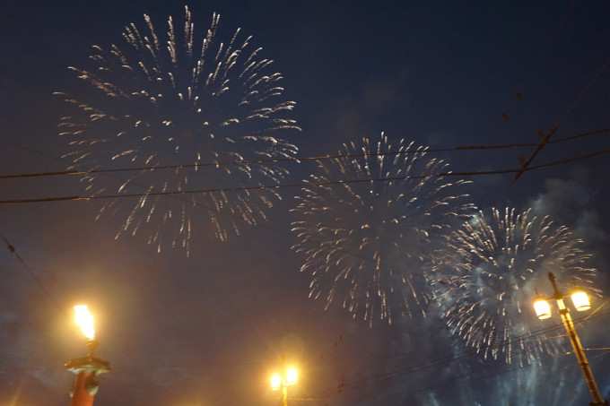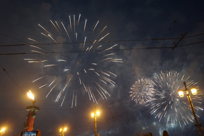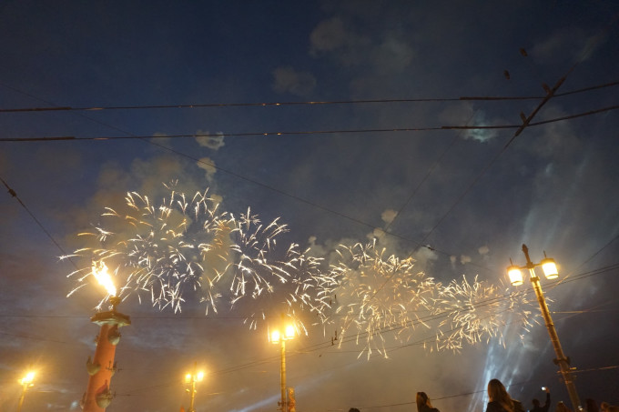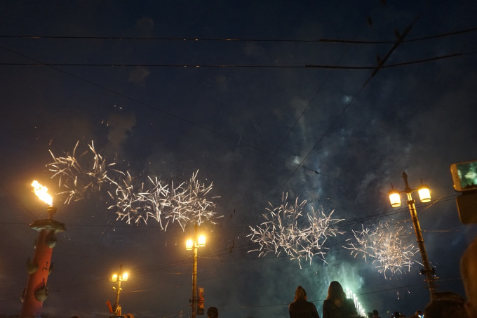 接下来是2017 年,不如2016年的种类多,感觉俄罗斯政府可能财政赤字吧,毕竟经济不景气,还要建世界杯体育馆。今年人少多了,我们选择在瓦西里岛上看,虽然是6月了,彼得堡还是很冷的,晚上还是穿了毛衣出门。排队的时候,俄罗斯人还问我,为什么来俄罗斯看烟花,中国的烟花比俄罗斯的又大又好看,说烟花都是从中国买的。我竟无言以对。