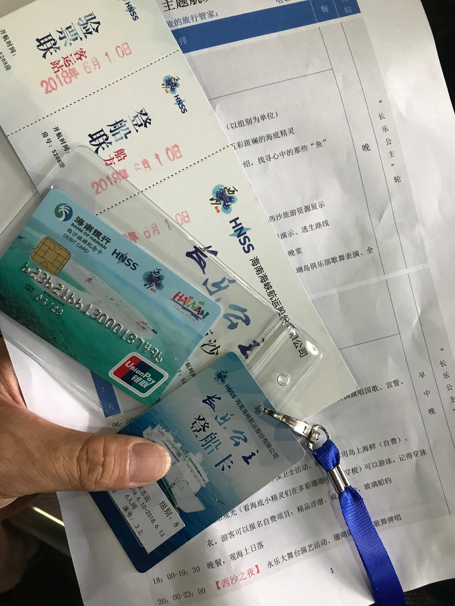 带鱼一一核对了我们的身份,给每人发了一条蓝色带子的胸牌,一共挂着三样东西:纸质的登船卡,蓝色的身份识别卡和一张银行卡。纸质登船卡在码头登船时使用;蓝色的身份识别卡,一日三餐的时候出示,需要登岛时交给管家,从岛上返回邮轮时取回,这样便于管家知道谁在岛上,谁在船上,不会发生“丢人”的事;银行卡的作用之前已经说过,在船上购物时使用,转账进去就可以,十天后,转进去的余额会原路返回你自己的卡里,那张银行卡,也留给你做纪念了。