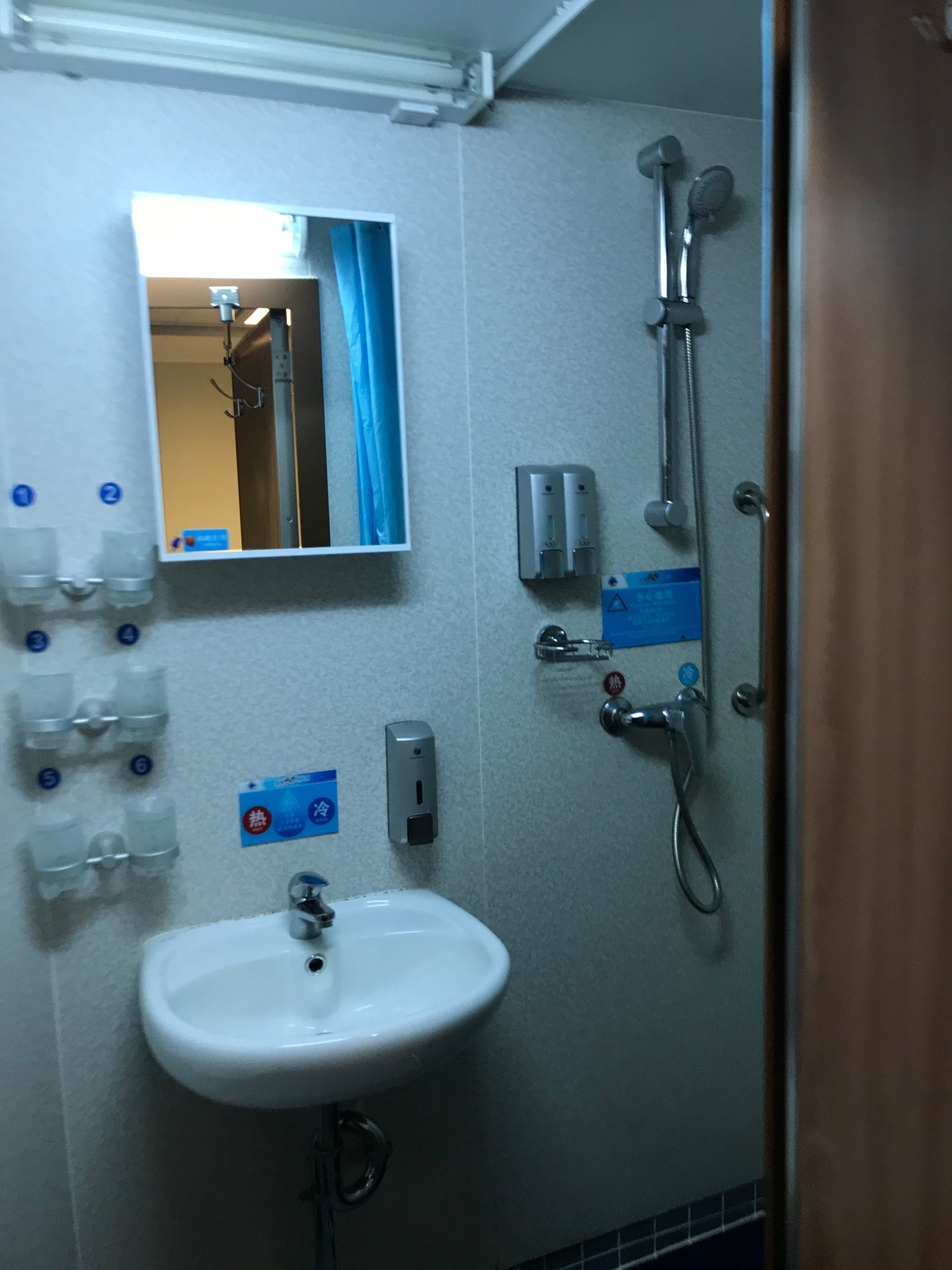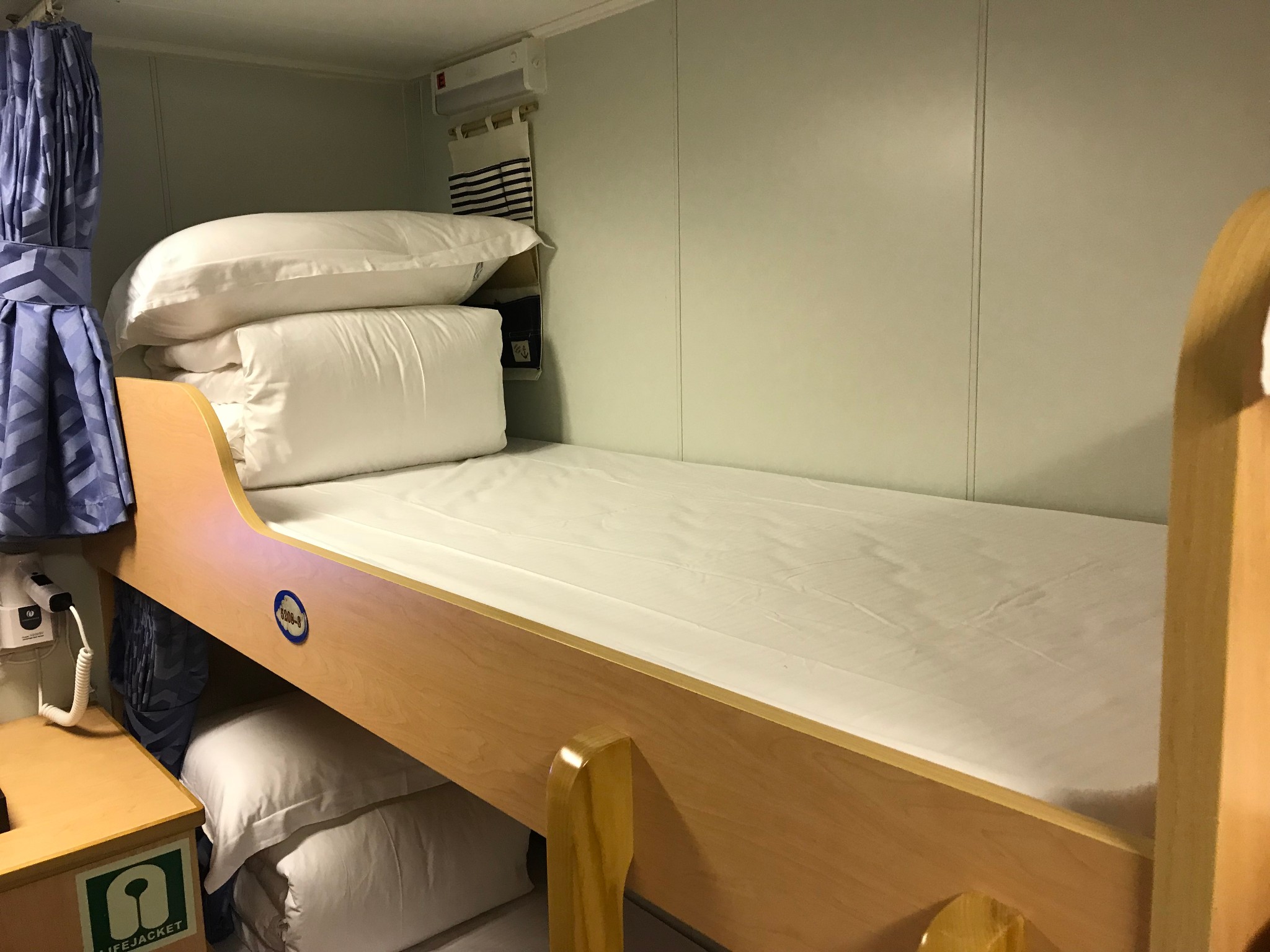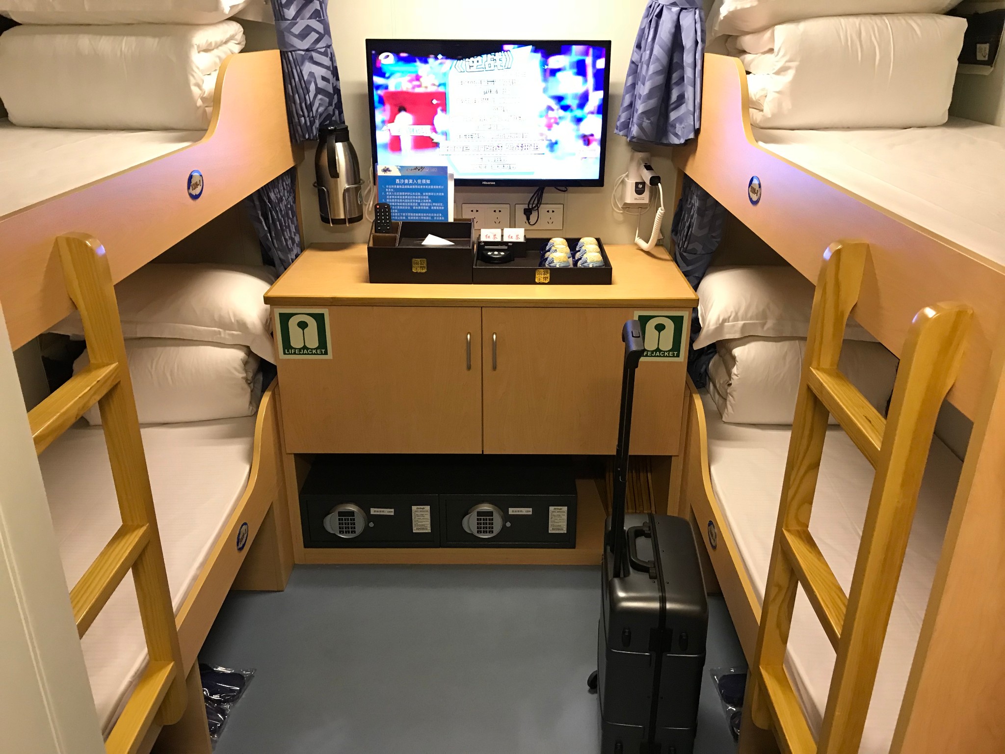 这是船上最便宜的房间,内舱房6人间,三张上下铺的床位,一台电视,一个茶台,一个独立卫生间。每张床下可以放进两个行李箱,床的高度空间略小,我176的身高,坐在床上抬不起头,床单洁白,被子叠得像豆腐块一样,床下的塑料拖鞋用透明塑料袋包着。茶台上有六个杯子,一个水壶,一个杂志架和一个纸巾盒,电视机挂在茶台上方的墙面上,下方是四个五孔插座(不够每床一个),茶台下方有两个小型保险柜。卫生间空间虽小,五脏俱全,洗漱台上方的镜柜里有六套洗漱用品,毛巾架上有六条大浴巾和六条毛巾,全都柔软洁白,触感很好,淋浴的热水是24小时供应的。房间里的空调很凉,晚上睡觉时还得把被子盖严才行。