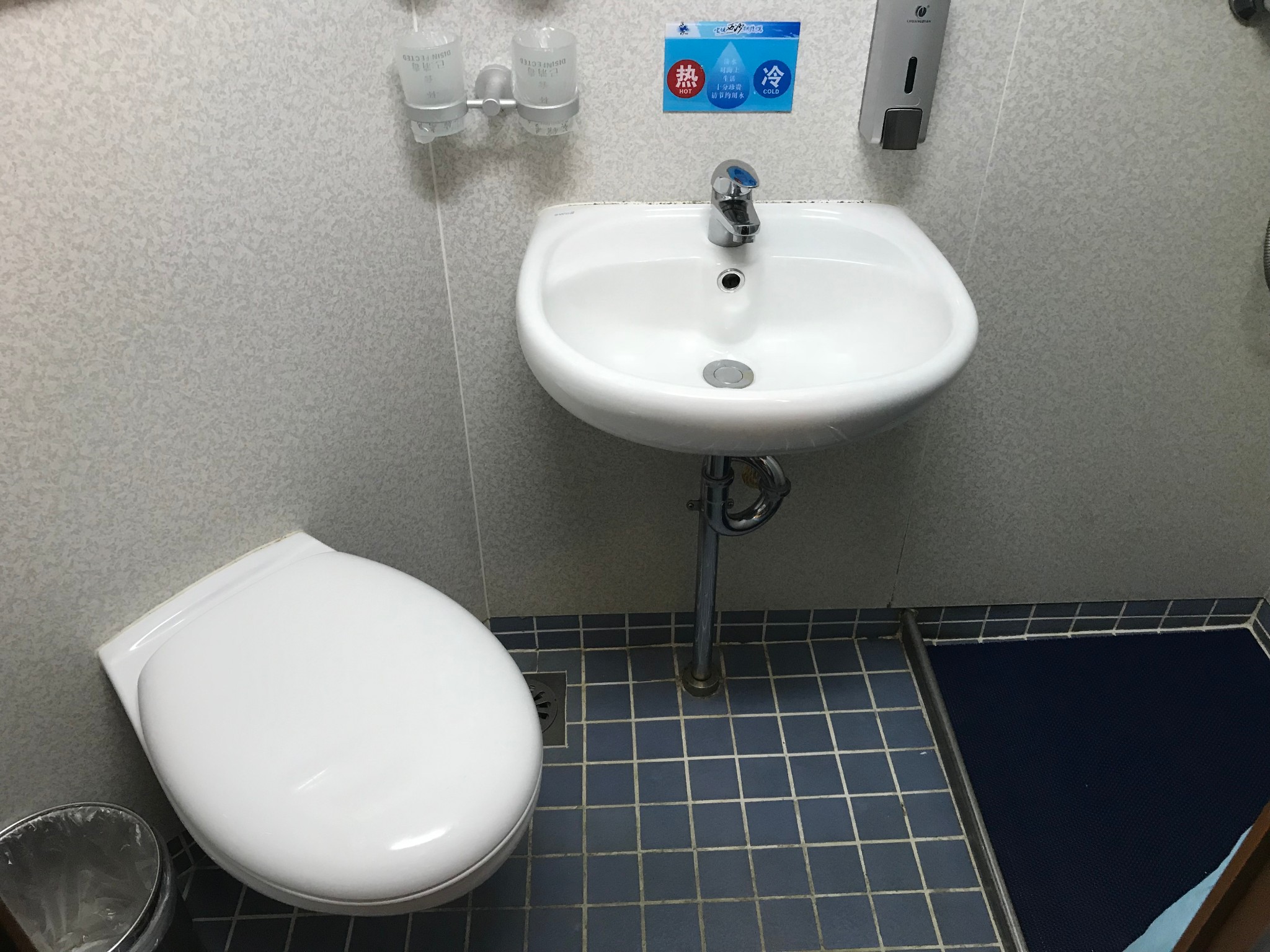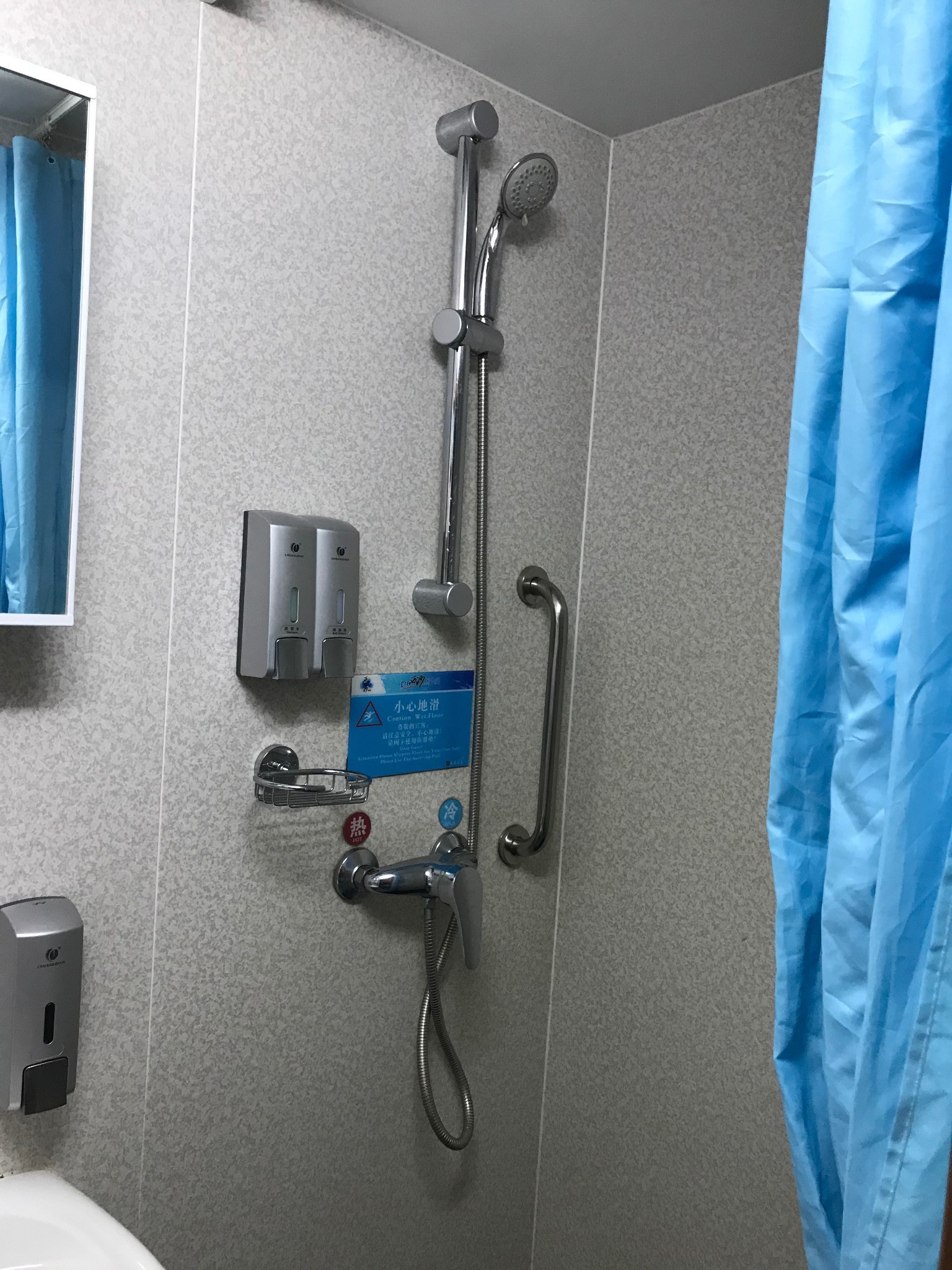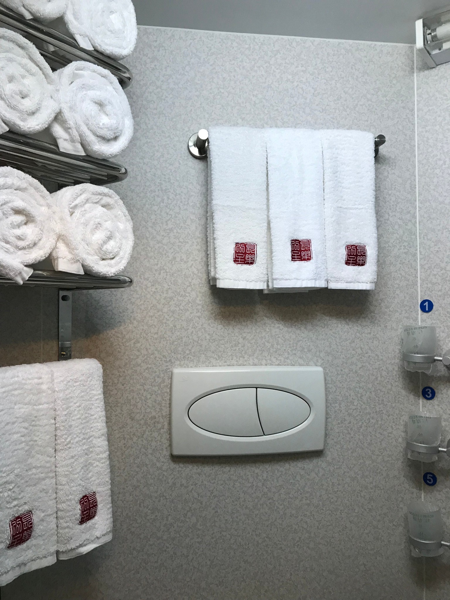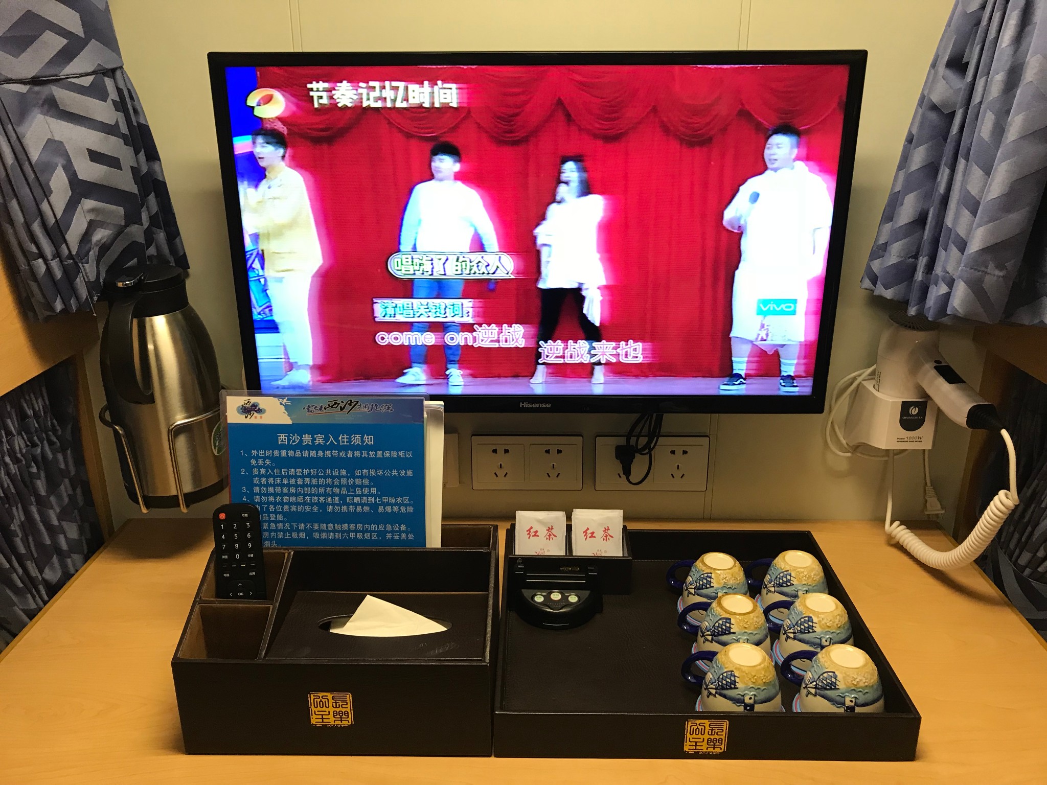 这是船上最便宜的房间,内舱房6人间,三张上下铺的床位,一台电视,一个茶台,一个独立卫生间。每张床下可以放进两个行李箱,床的高度空间略小,我176的身高,坐在床上抬不起头,床单洁白,被子叠得像豆腐块一样,床下的塑料拖鞋用透明塑料袋包着。茶台上有六个杯子,一个水壶,一个杂志架和一个纸巾盒,电视机挂在茶台上方的墙面上,下方是四个五孔插座(不够每床一个),茶台下方有两个小型保险柜。卫生间空间虽小,五脏俱全,洗漱台上方的镜柜里有六套洗漱用品,毛巾架上有六条大浴巾和六条毛巾,全都柔软洁白,触感很好,淋浴的热水是24小时供应的。房间里的空调很凉,晚上睡觉时还得把被子盖严才行。