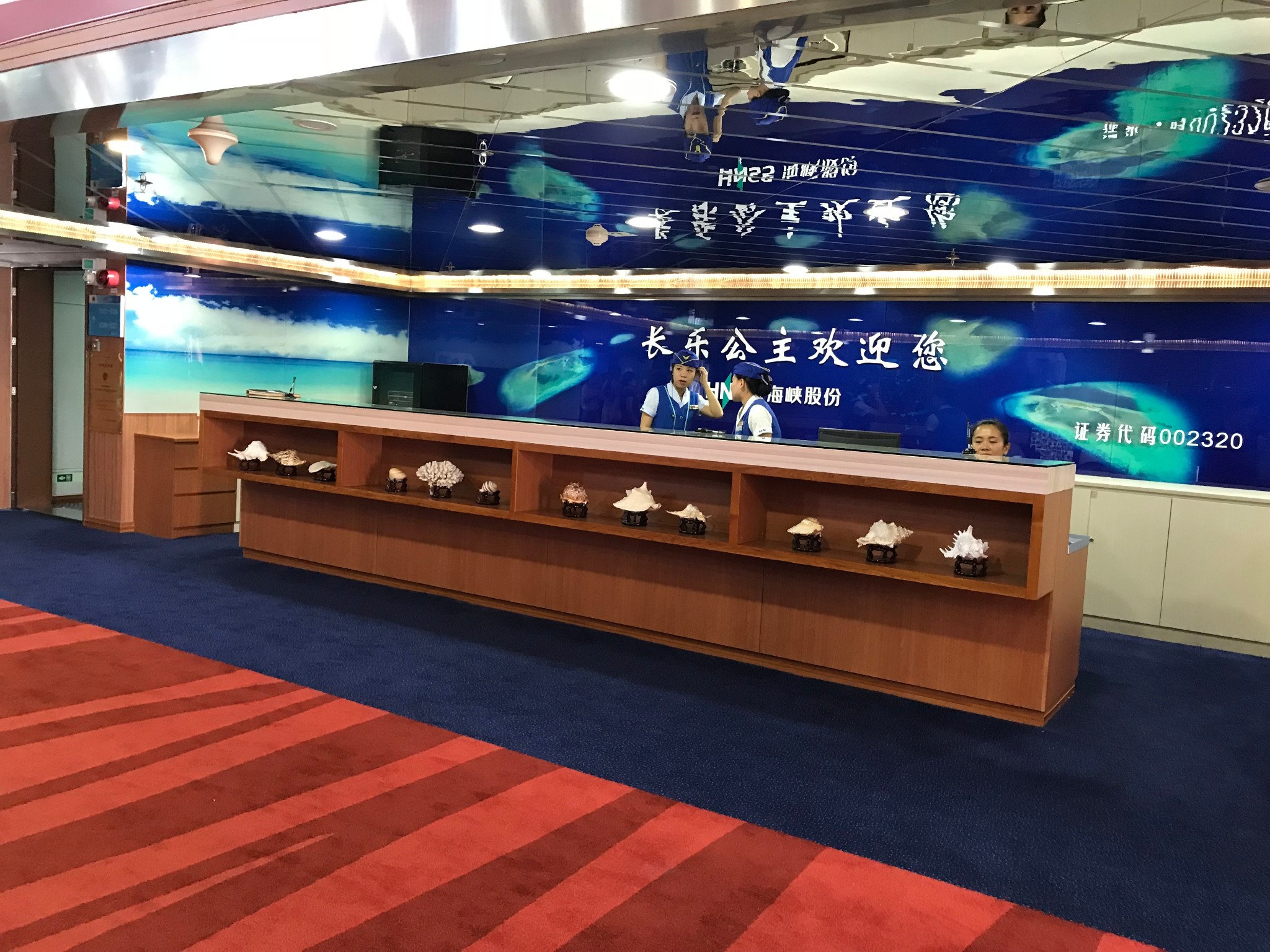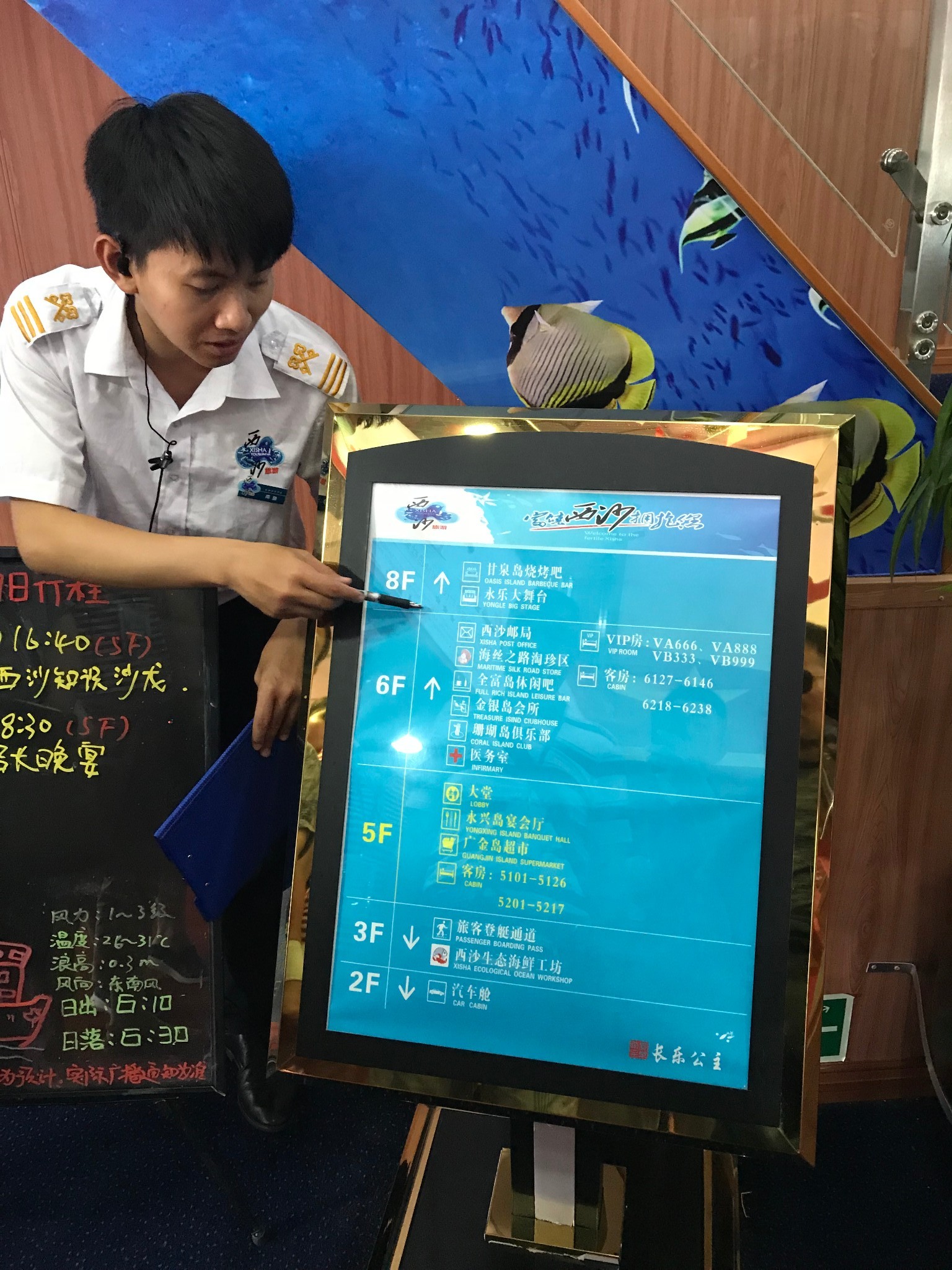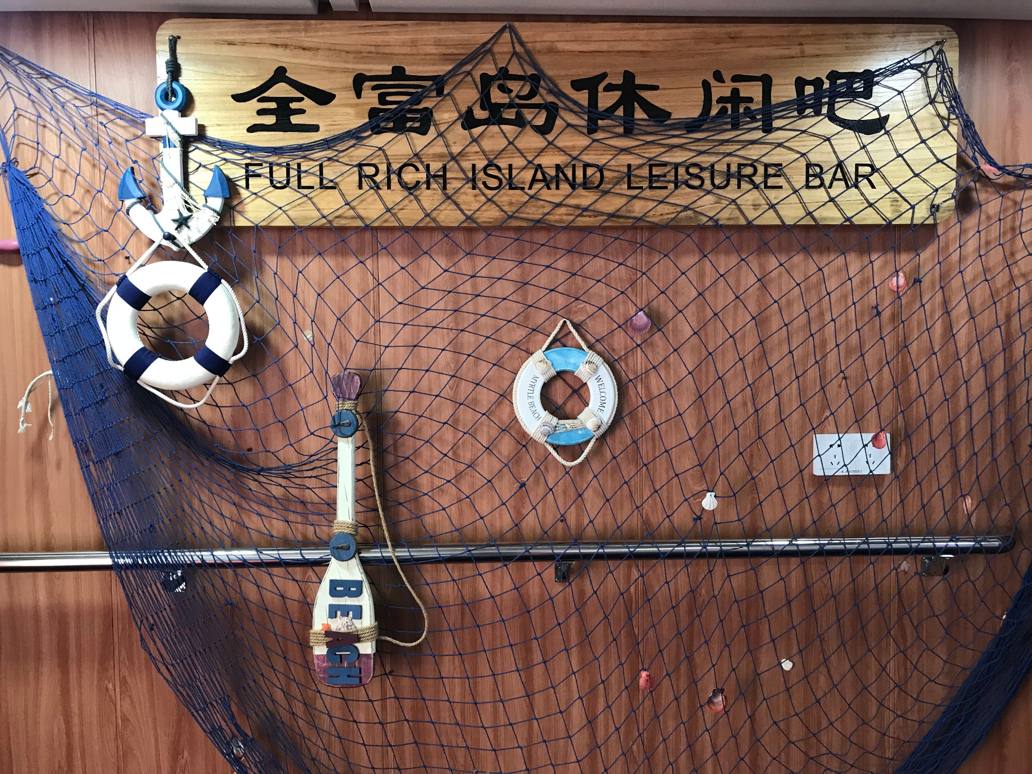 我们登船的“大门”在5层,这里也是整个船内舱的活动中心,服务台也位于5层,客舱分布在5,6两层靠船头的一侧,5层另一侧是餐厅“永兴岛餐厅”和超市,6层楼梯两侧的区域,一边是“海上邮局”,可以寄明信片,另一边是海上收费项目的咨询区,潜水和钓鱼等额外收费的项目,在这里办理。6层靠近船尾一侧是娱乐空间,包括“全富岛休闲吧”和“银屿岛会所”,这里是额外消费的区域,可以打麻将,唱歌,或者点一杯咖啡,喝点啤酒。
