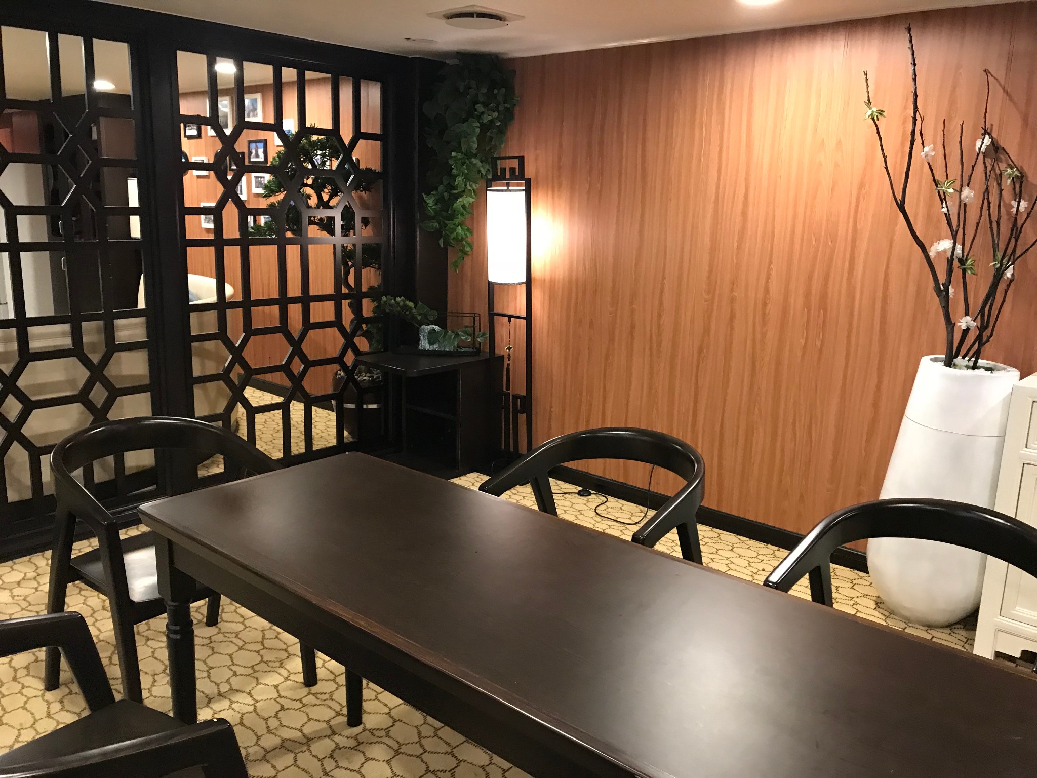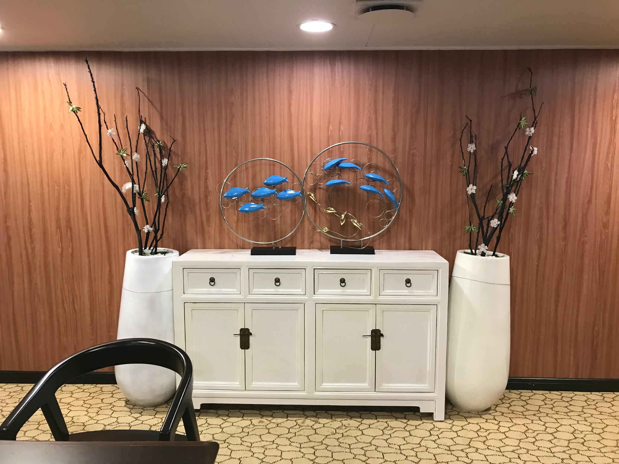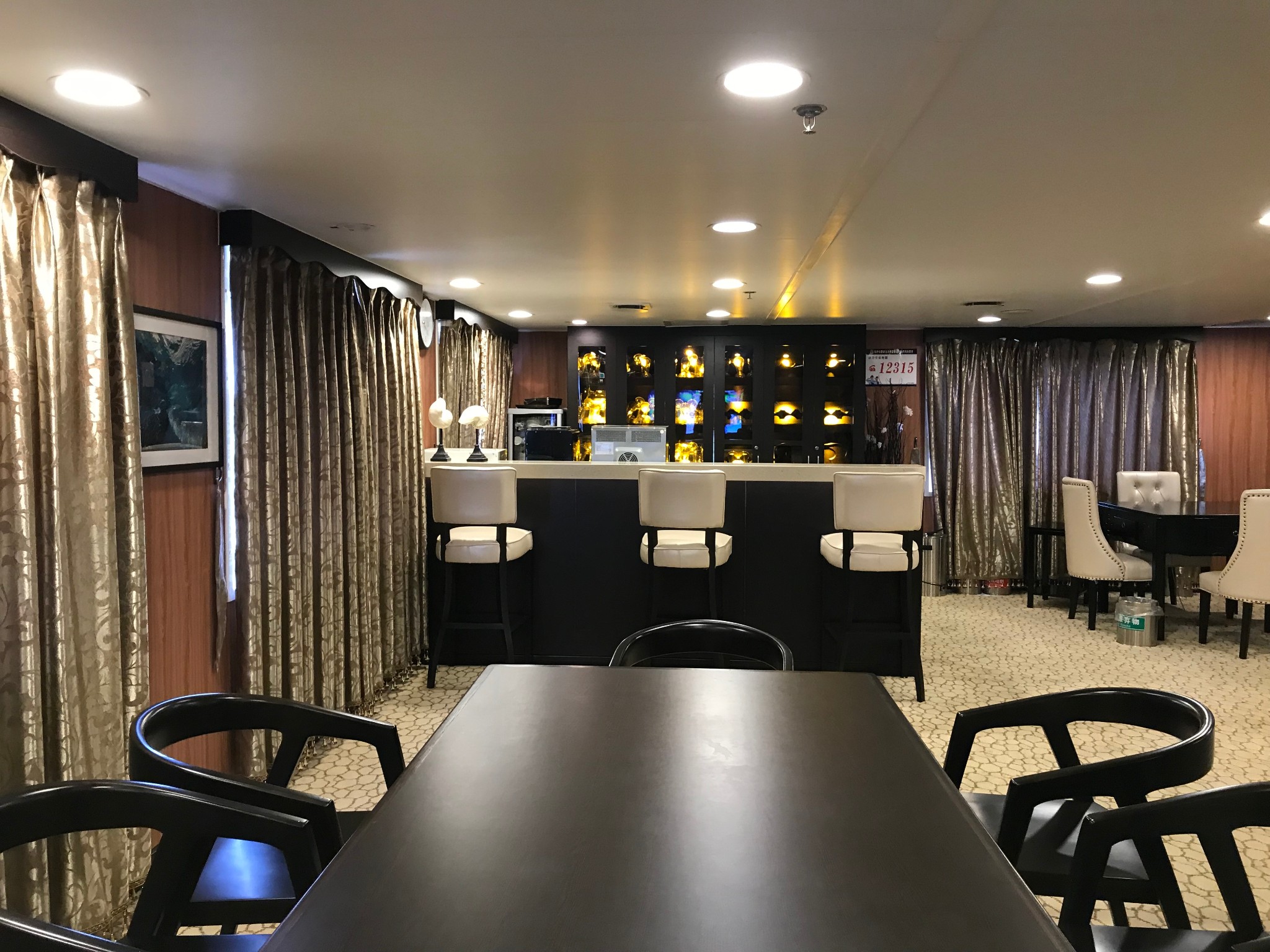 我们登船的“大门”在5层,这里也是整个船内舱的活动中心,服务台也位于5层,客舱分布在5,6两层靠船头的一侧,5层另一侧是餐厅“永兴岛餐厅”和超市,6层楼梯两侧的区域,一边是“海上邮局”,可以寄明信片,另一边是海上收费项目的咨询区,潜水和钓鱼等额外收费的项目,在这里办理。6层靠近船尾一侧是娱乐空间,包括“全富岛休闲吧”和“银屿岛会所”,这里是额外消费的区域,可以打麻将,唱歌,或者点一杯咖啡,喝点啤酒。