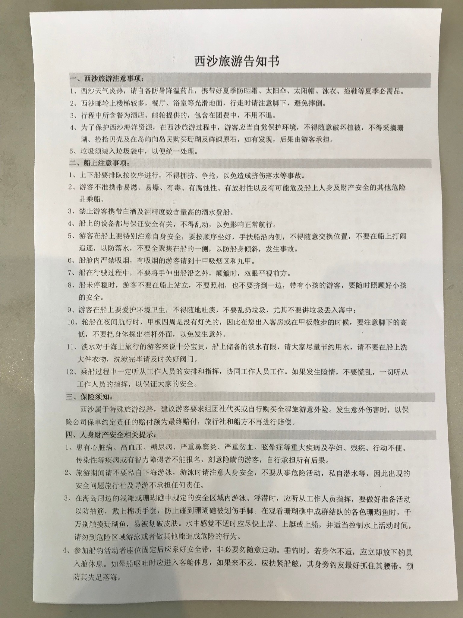 西沙梦,就这样要实现了,我一边按照提示准备前往西沙的用品(网上购买页面和旅游告知书上都有提示),一边祈祷老天爷给个好天气,让我能顺利出行,因为就在6月8号,刚刚过去一个台风,如果遇到台风,航次是要取消的。