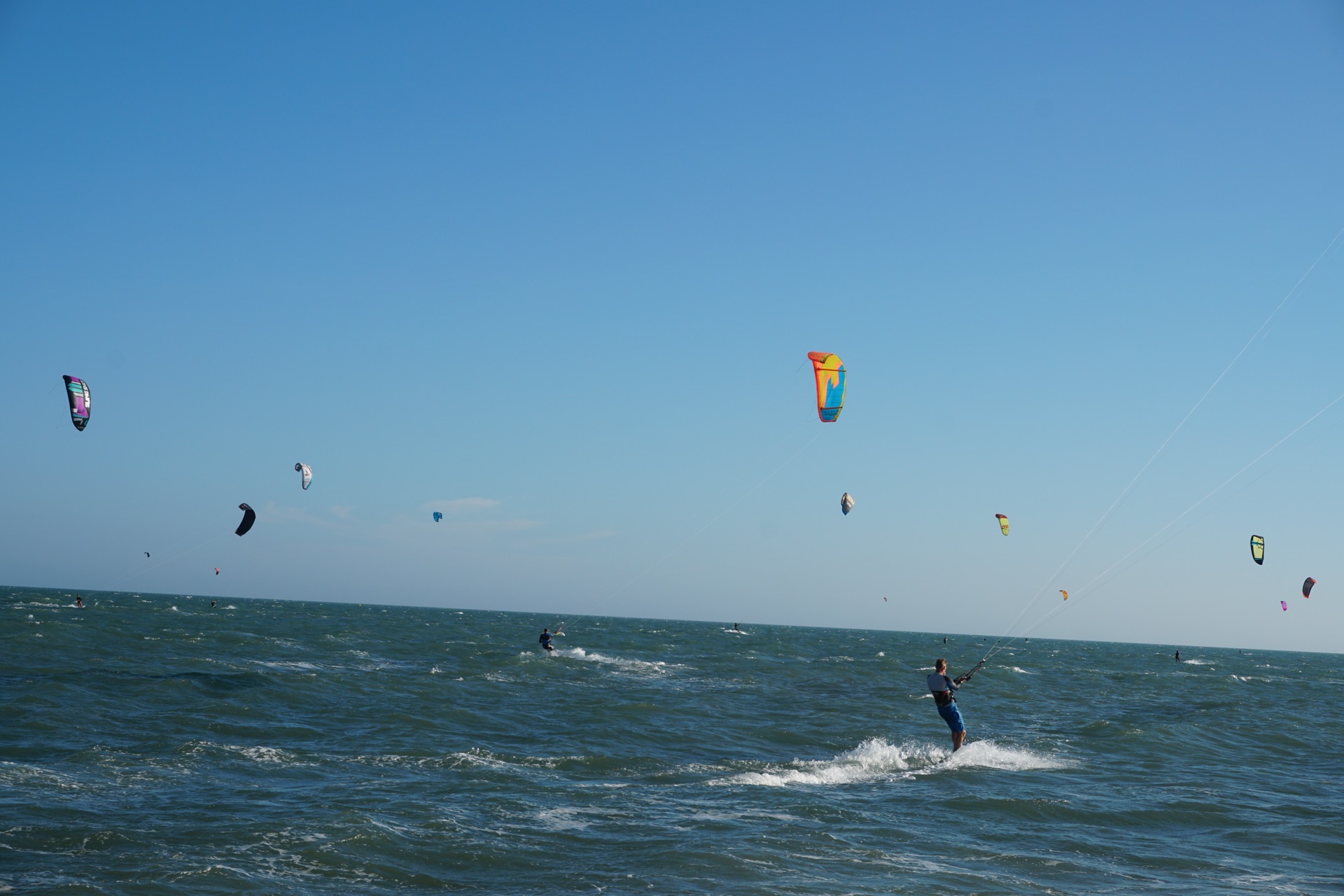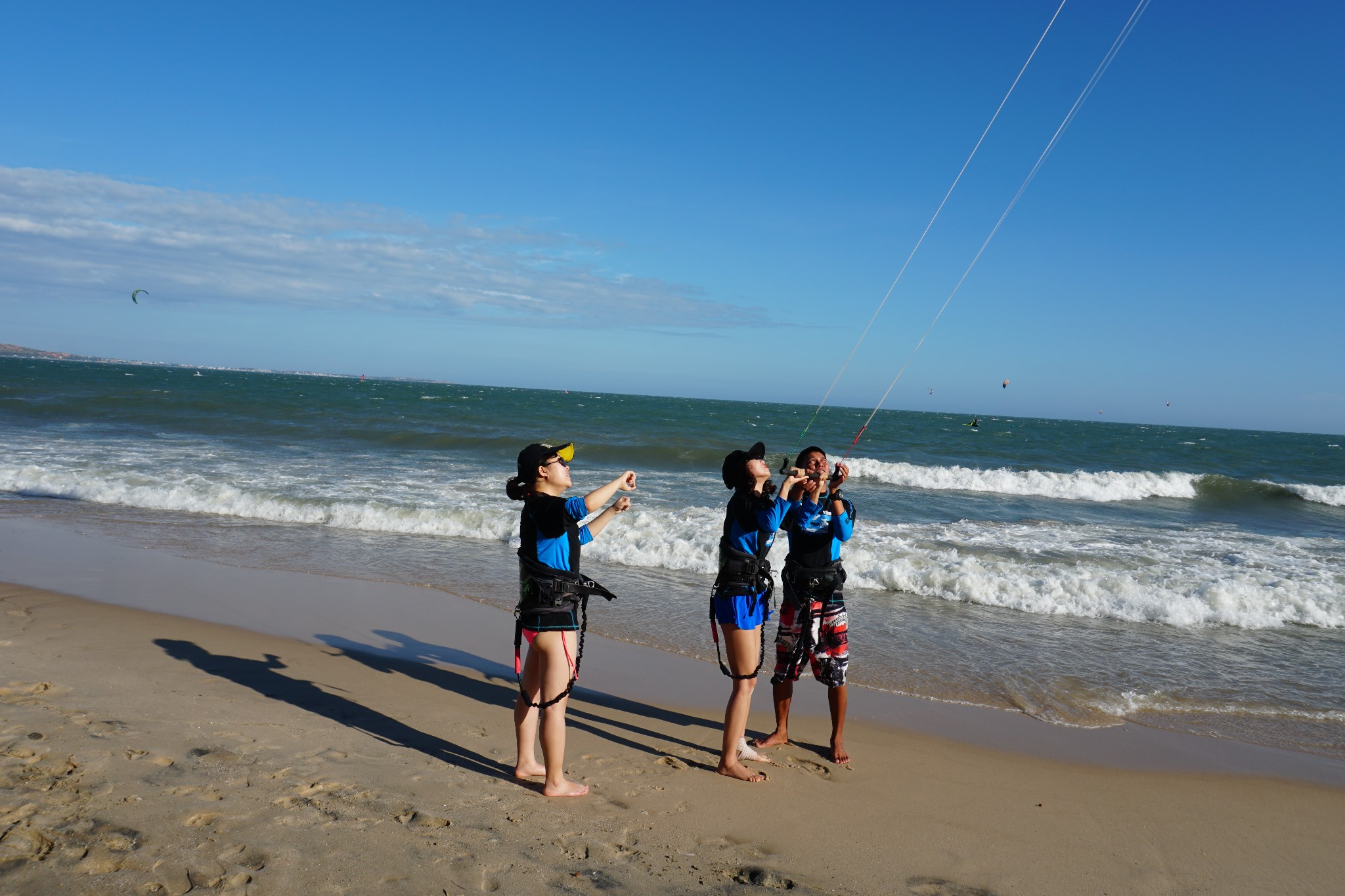 两个小时的学习只能保证让风筝保持在合适的风向位置,真正要下海是遥不可及的。系统的学习,抱板下海-升帆-踩板-滑翔冲浪-卸板返回,完整的过程至少3天,前提还是超级熟悉水(海)性。像我们这种,只会在泳池里扑通的姑娘(教练带下了海,才知道自己根本不会游泳,不会。。。),在两个小时后,只能教练控帆,拽着我们,在海里荡几分钟,体验一下海水的腥咸,不服不行。提醒一定要戴帽子和墨镜(不能戴隐形),教练把自己的给了我