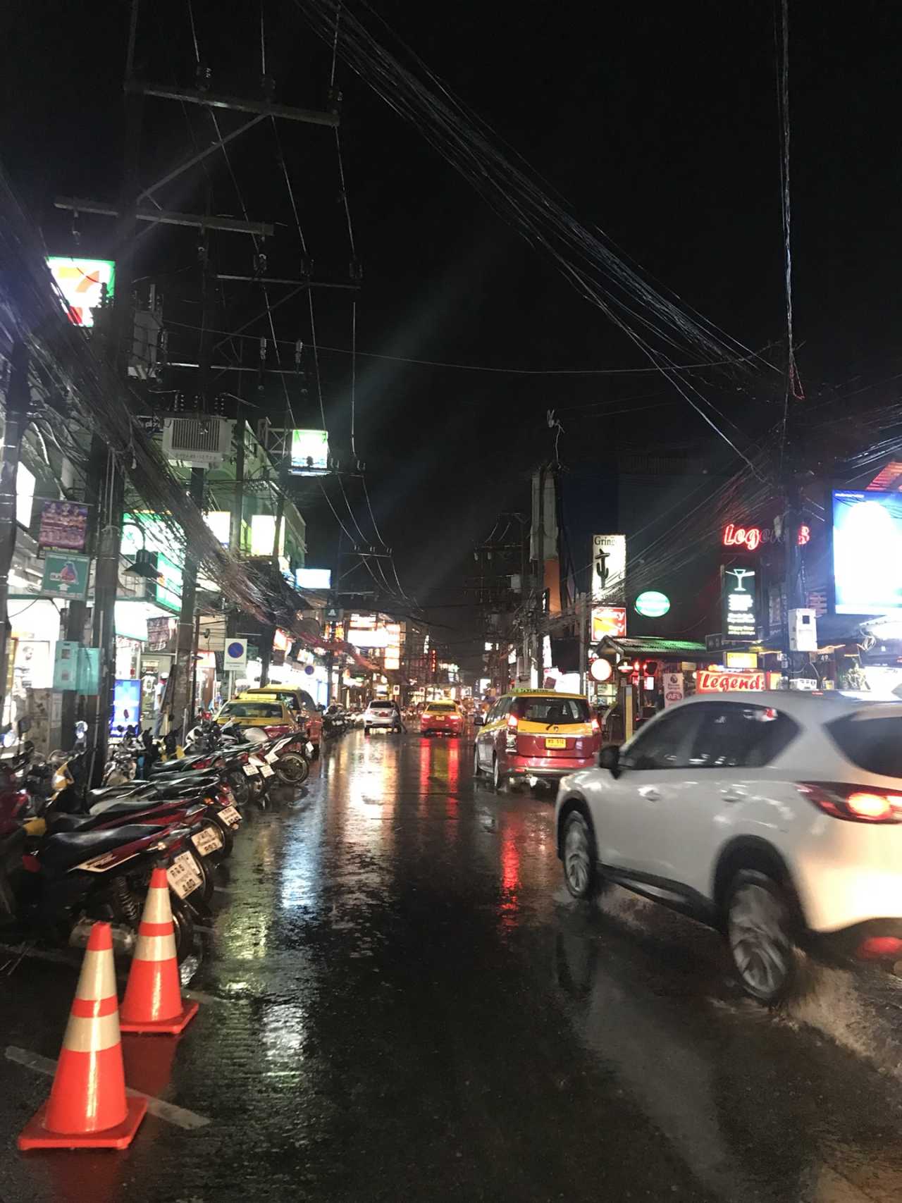 就这样一直等雨停,好不容易雨小点了,问酒店借了几把伞,涉水出去吃晚饭~苏梅岛的街道,相当破乱,积水了走路也湿答答的。