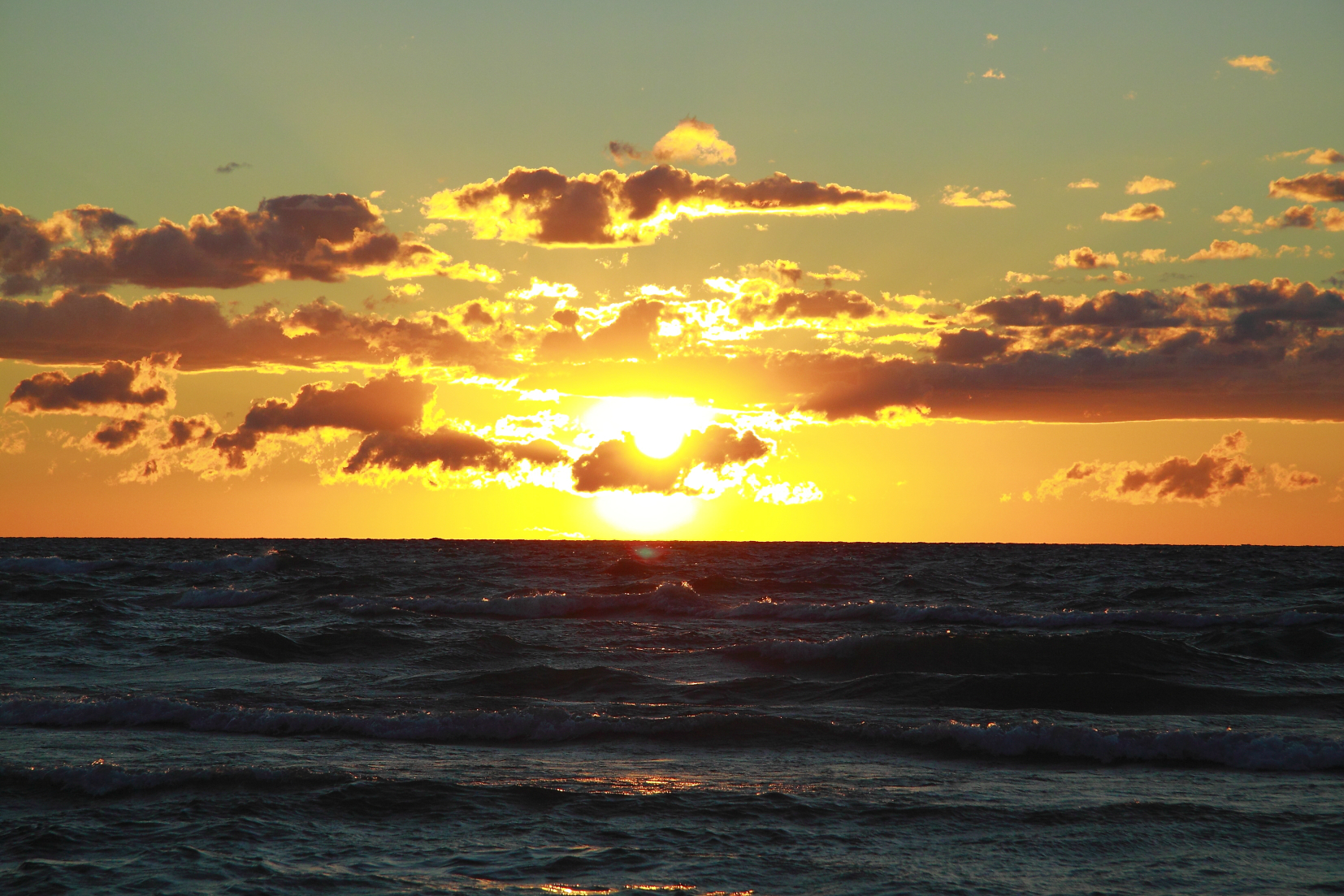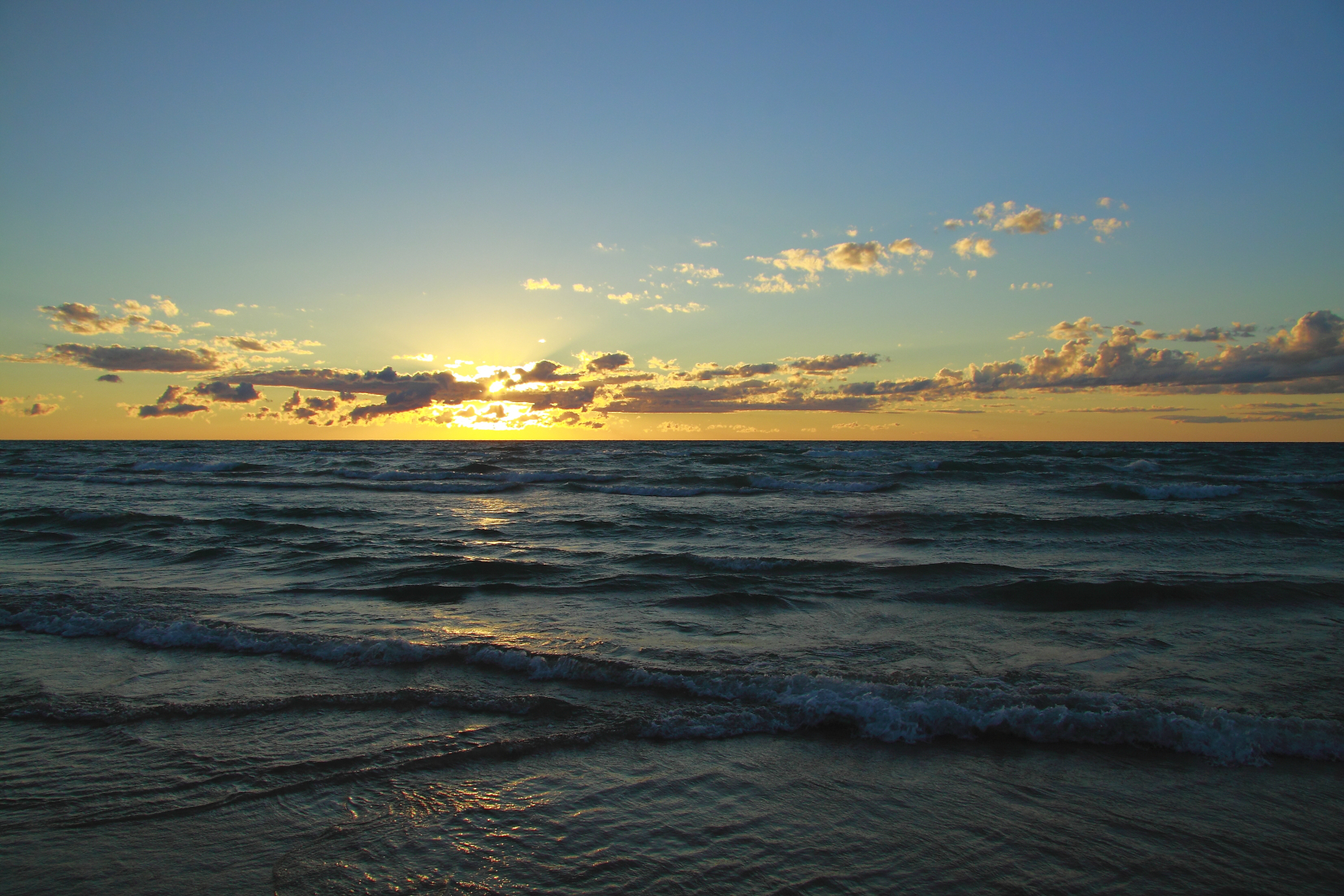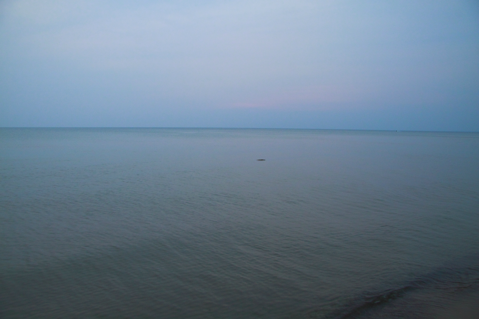 日落时分天空布满了乌云,安静的休伦湖与天空在遥远处交界