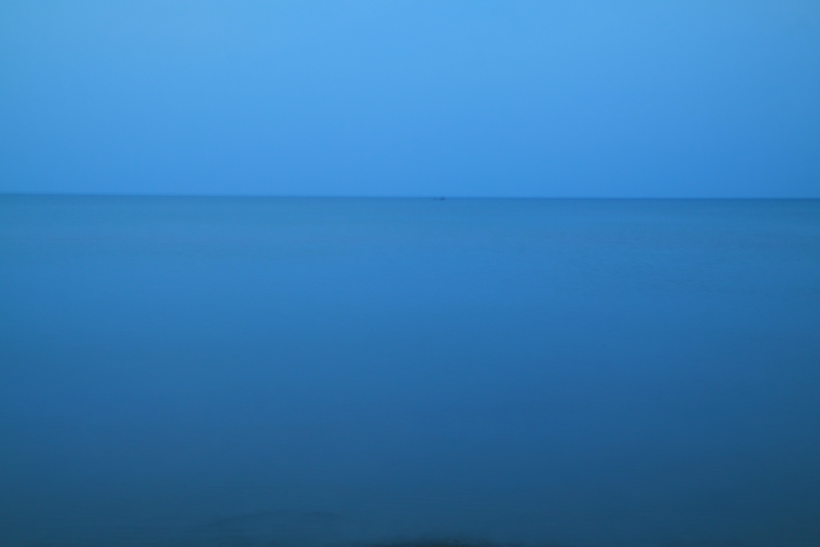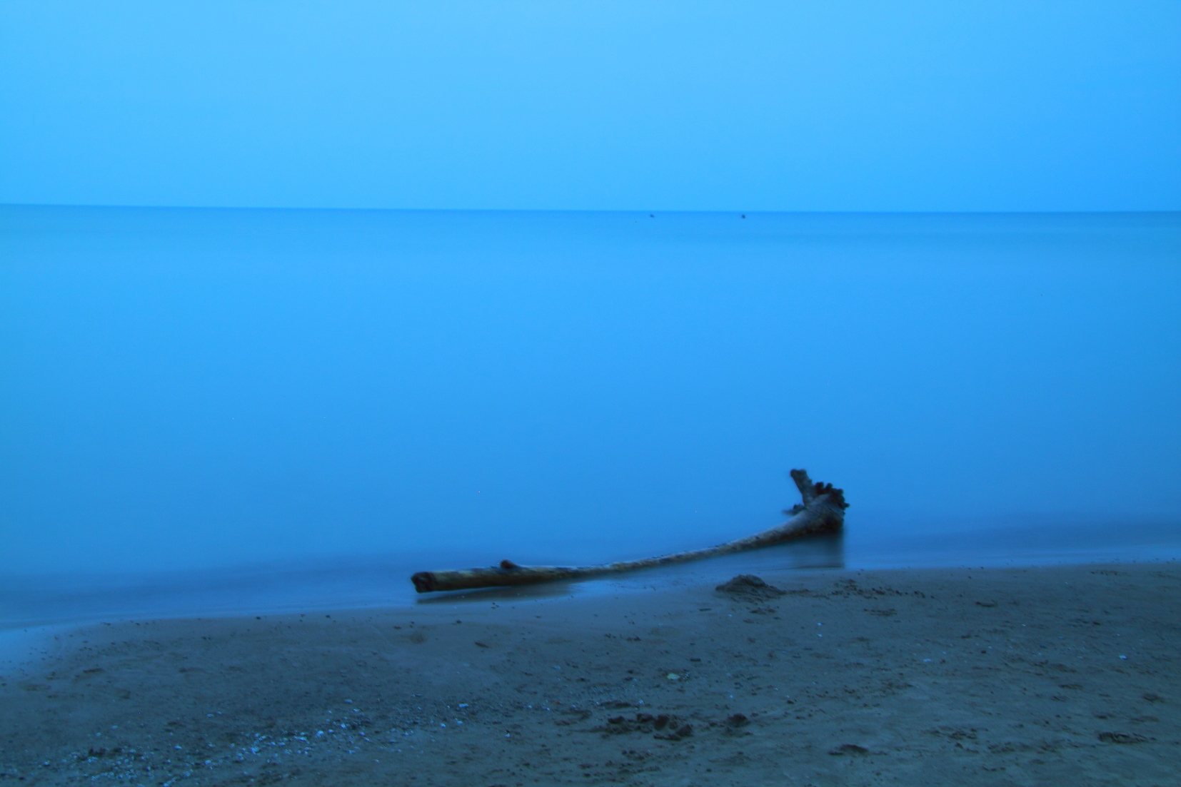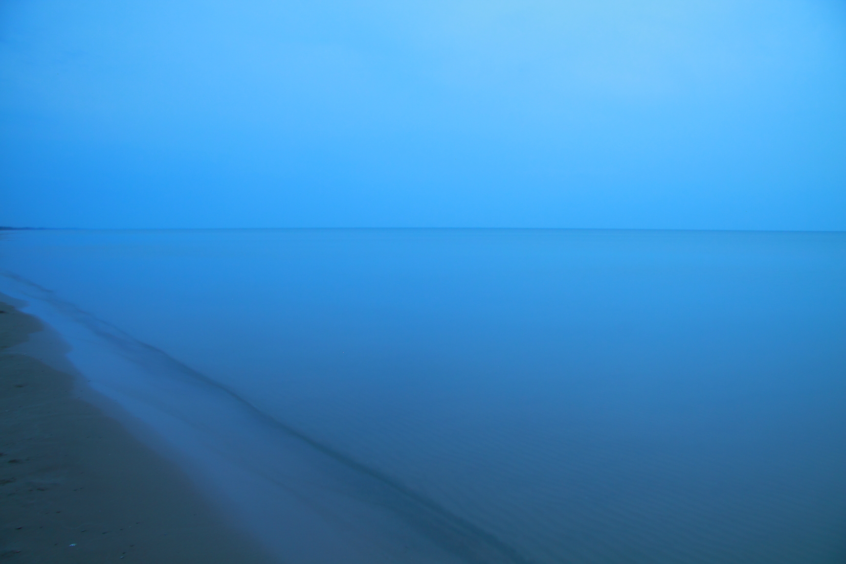 日落时分天空布满了乌云,安静的休伦湖与天空在遥远处交界