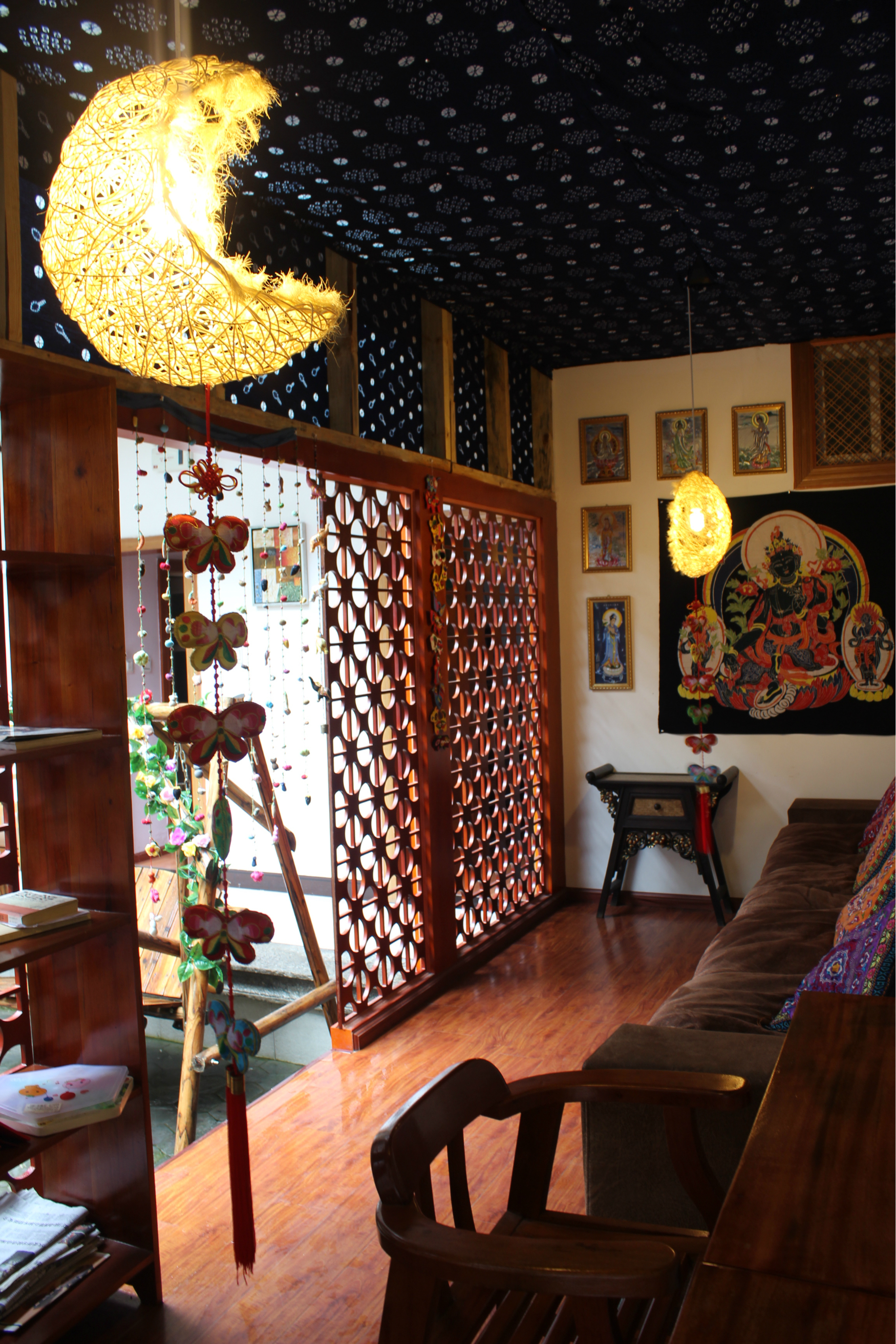 提前在淘宝上预定的,梦心谷客栈 ,大理 古城南门附近,客栈老板人和前台MM都很热情,第二天要离开的时候赶上下雨,老板还特意让司机送我们到搭车的地方。客栈的公共区域布置的有感觉,房间略小,设施挺全的。PS:客栈旁边是城隍庙,介意的同学要慎重。