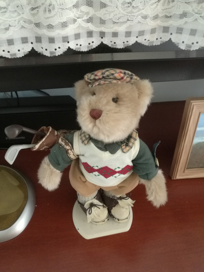 背着高尔夫球杆的小熊,想当初它的主人是多么的喜爱他,还记得主人当初与它分别时温暖的笑容和依依不舍眼神,慵懒随意的斜靠在背后停放自行车上,挥手目送我走远样子…同样喜爱高尔夫运动的姐夫把它摆放在家里。小熊又寻到了它最好的伙伴