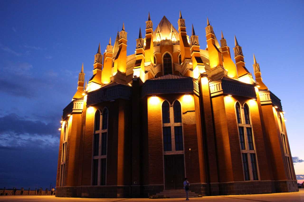 先是推荐婚礼宫吧,当地人一般叫它鹰山教堂,在东山(鹰山)植物园内的小山坡上,是满洲里市制高点,看落日、看夜景都可以,所以优先推荐。哥特式风格,是满洲里的标志性建筑之一,当地人结婚基本都会在这里拍照和举行,教堂里是要花门票进去的(我只是去看夜景,不知道门票在哪购买