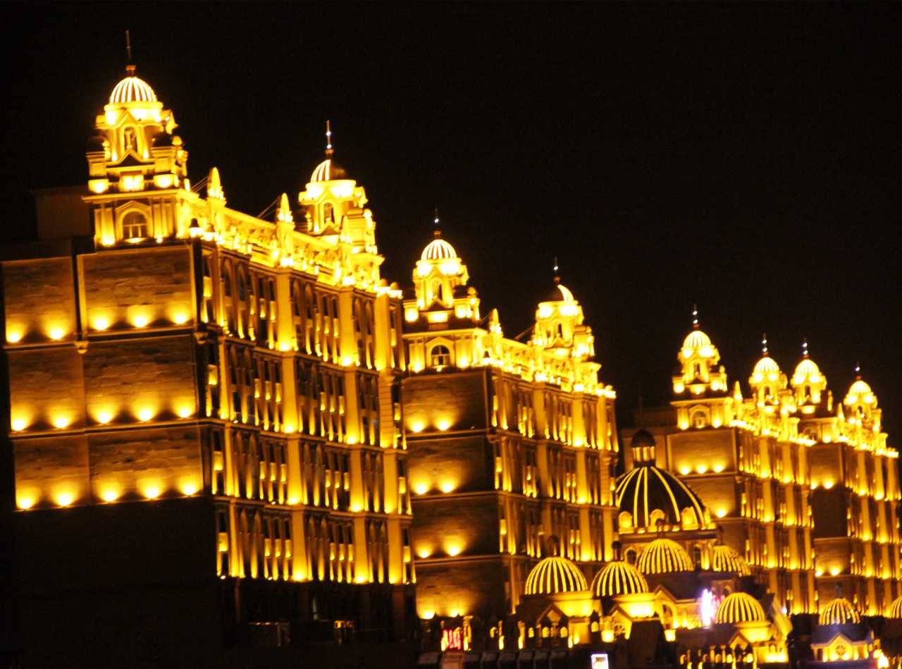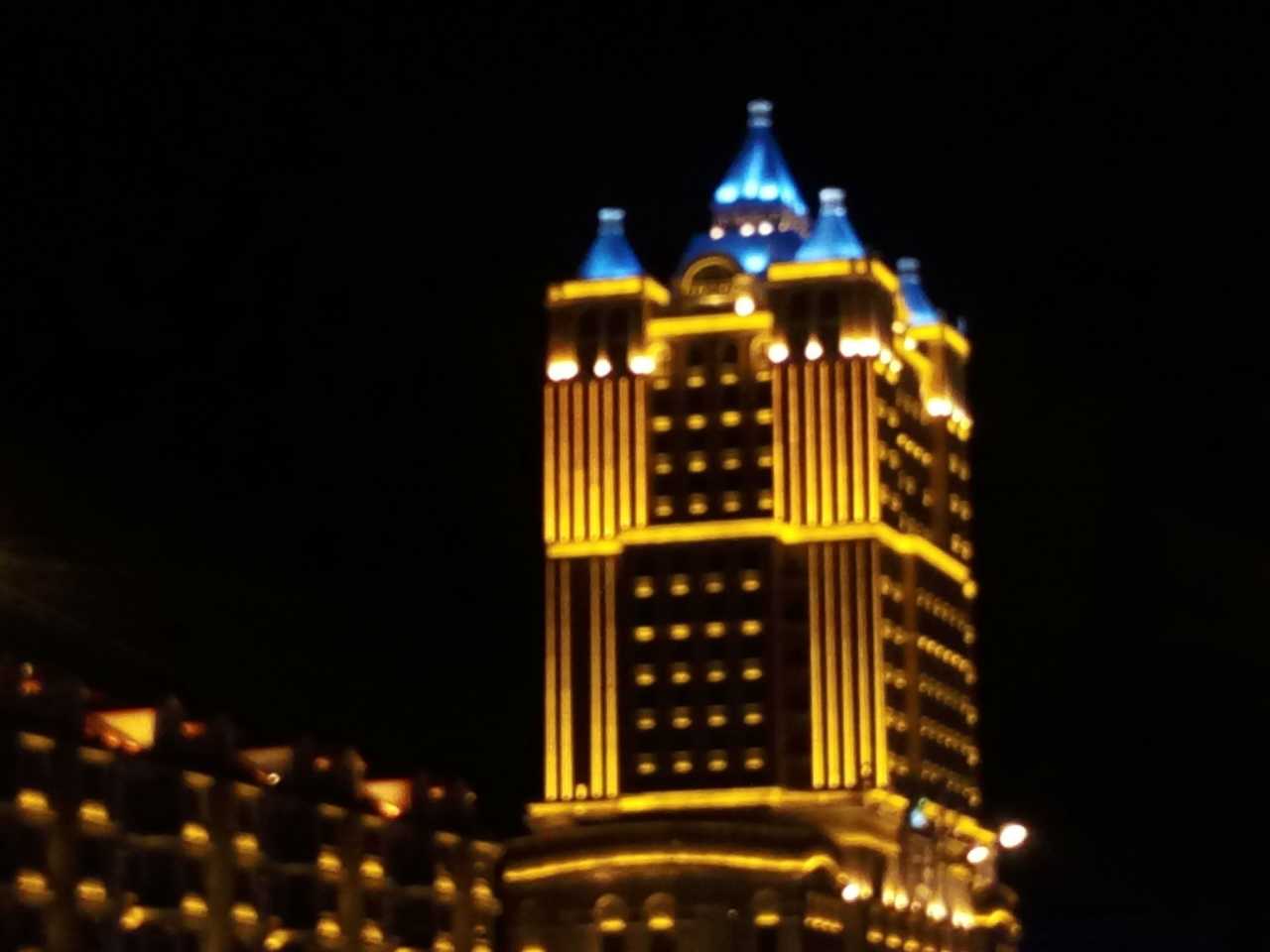 ,在市区瞎逛,后来又去了一次补回来的。额外提一下,在套娃酒店可以有免费的套娃门票,这个门票在退房之前,在营业时间内可以无限次的进出套娃广场,能进里面的两个表演场馆,不能游玩其他娱乐设施(6D电影、海盗船等,这些需要另外购票,套票需要100元。)套娃酒店个人推荐值得住宿一晚,巴洛克风格,金碧辉煌,墙面、屋顶都是壁画,据说是请俄罗斯的艺术家绘画的,爱好绘画的人应该很喜欢这里,光酒店都可以呆上一天了。言归正传,说回到夜景,这里的晚上比较热闹,几乎是必打卡的地方,完全不用担心回市区的交通问题。