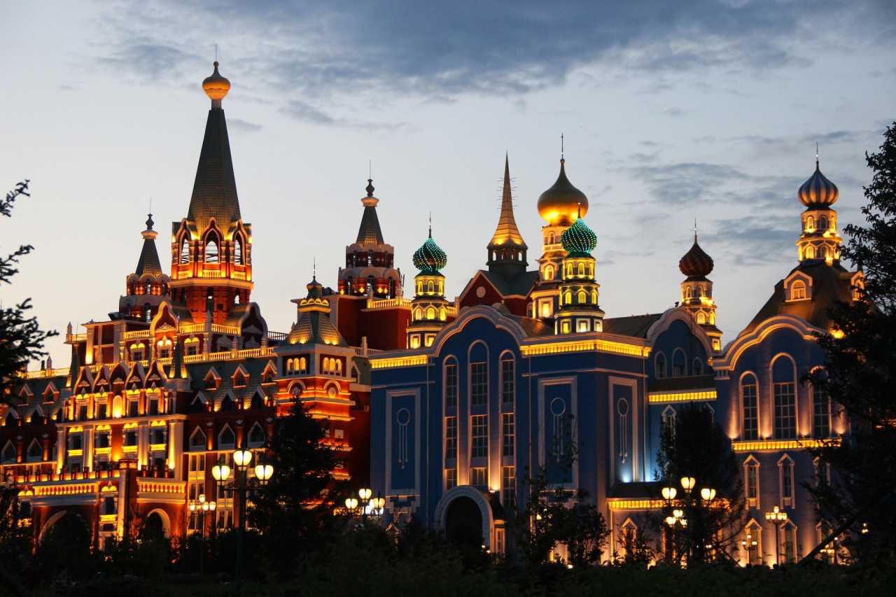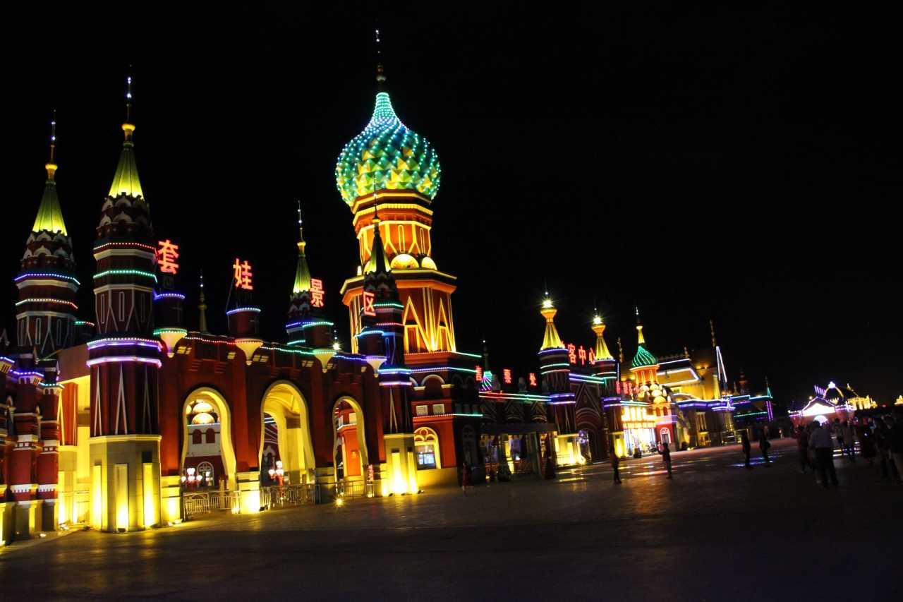 套娃广场的灯光是由他们自主控制的,在淡季熄灯的时间比较早,我在的那回大约23:00就熄了灯,(整个市区是00:00点)住在套娃酒店,愣是没看到套娃广场的夜景