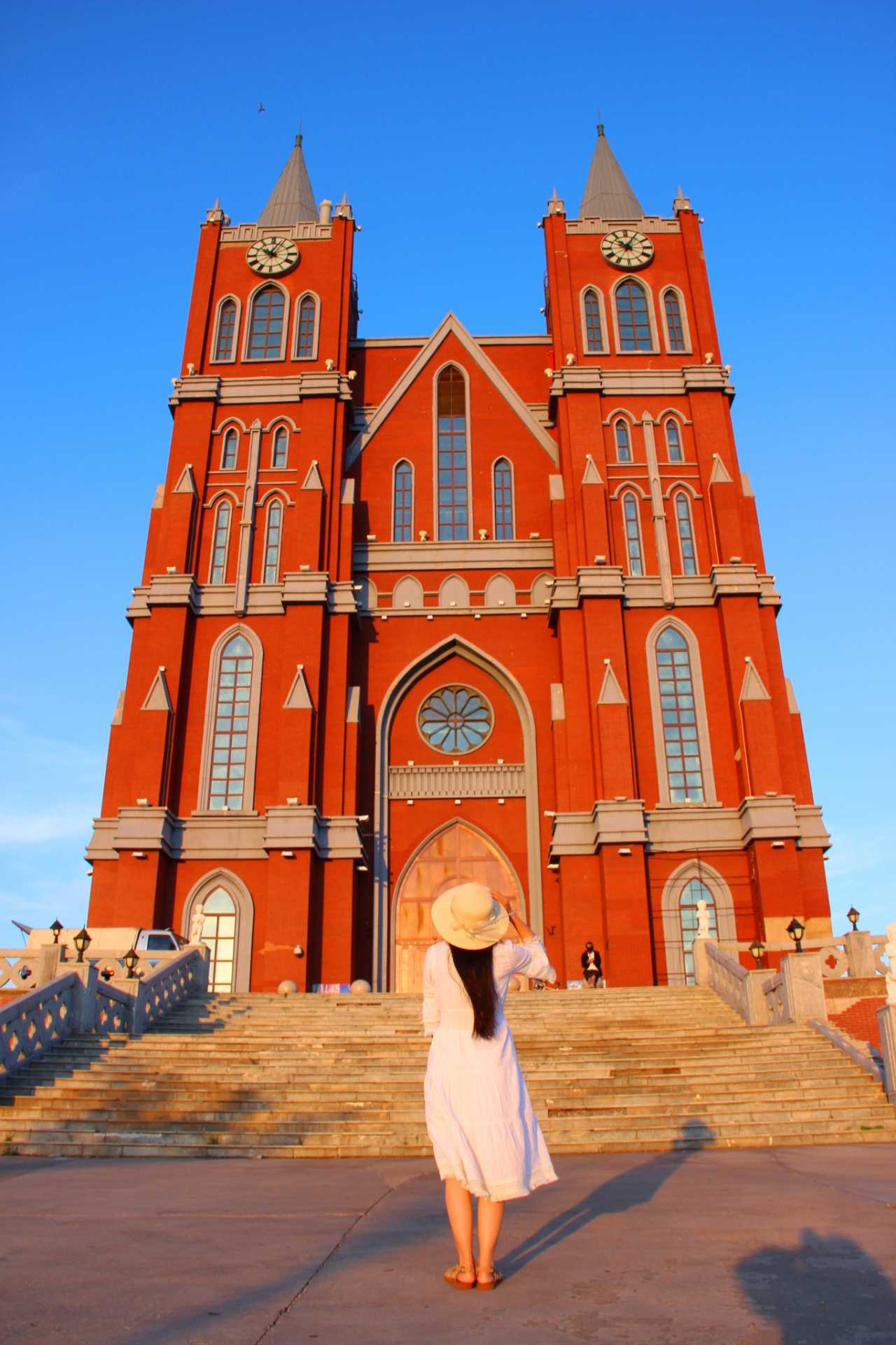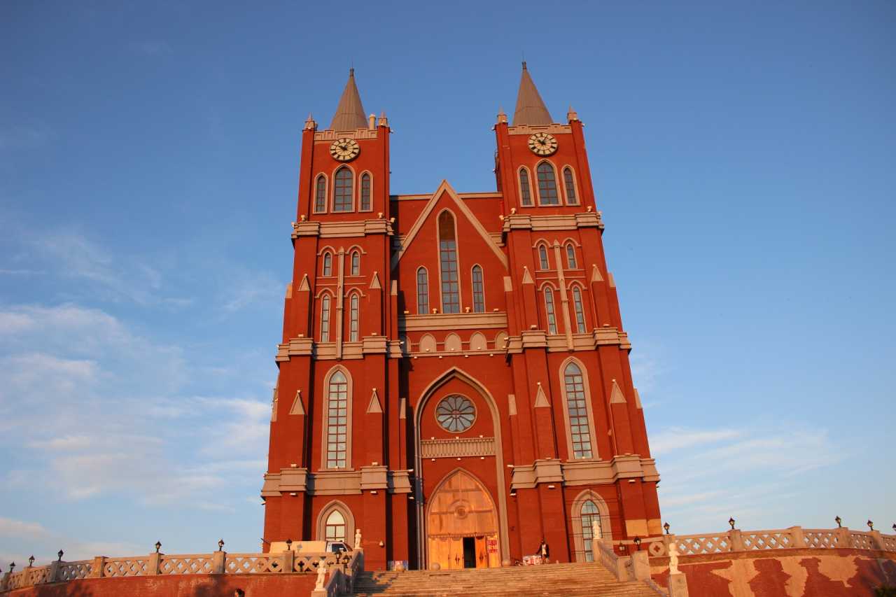 婚礼宫是暗桔红色的外墙和尖端向上整体结构,周围有一圈石砌的围栏,栏杆上有欧式的灯架。