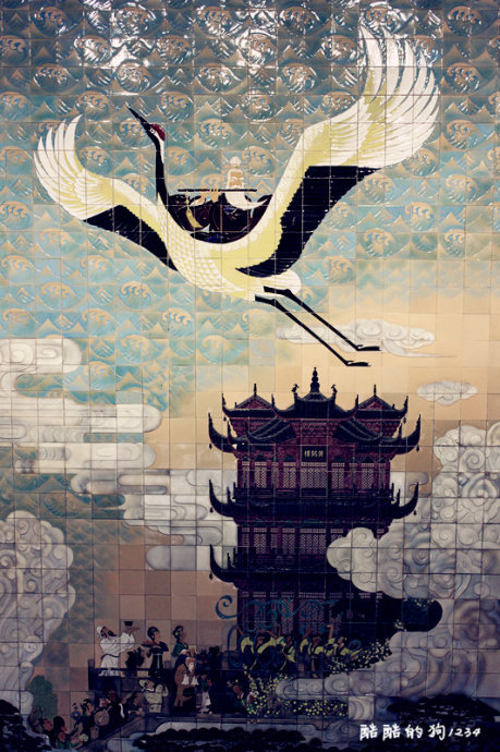 武汉的热绝对是名不虚传,才3月底已是有了夏天的味道,我穿短袖都是可以的,进入黄鹤楼后,映入眼帘的是一幅巨大的瓷砖画,一位老者吹笛驾鹤,几乎所有的小孩都会问,黄鹤楼的鹤为什么是白色的,我开始也有此疑问,但看到鹤的翅膀有黄色的,不知是画者有意而为之。直到现在我有没有查相关的文献,待以后再补课吧。
