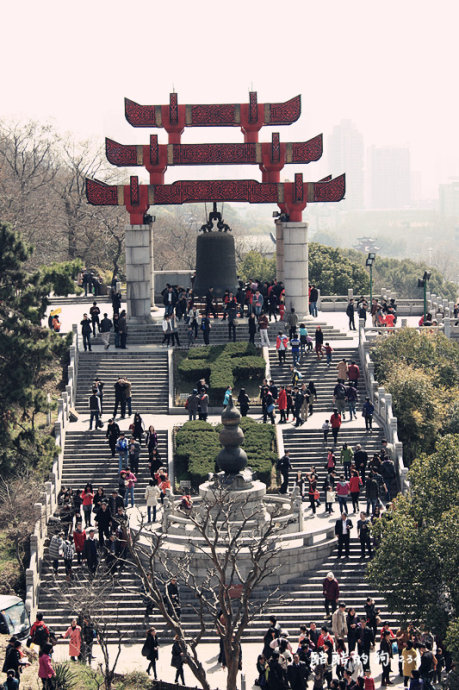 黄鹤楼上看远处的钟,这里感受到的热不是来自天气,而是黑压压的人群。