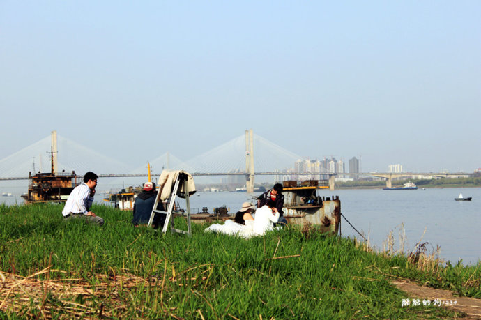 在三月的春风里,江滩显得是那么的和谐,有打情骂俏的情侣完全沉浸在二人世界中,有三五成群的小P孩追逐打闹,不知天高地厚的沿江奔跑,还有一家三口,爸爸牵着孩子的左手,妈妈牵着孩子的右手在时光中漫步,有老者在放风筝,有老者在席地聊天,有小孩吹着气泡,还有的,如下,一对对新人看着长江迎接明天的美好。