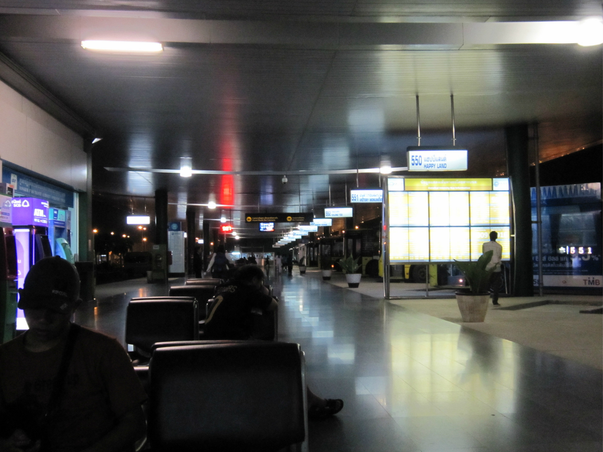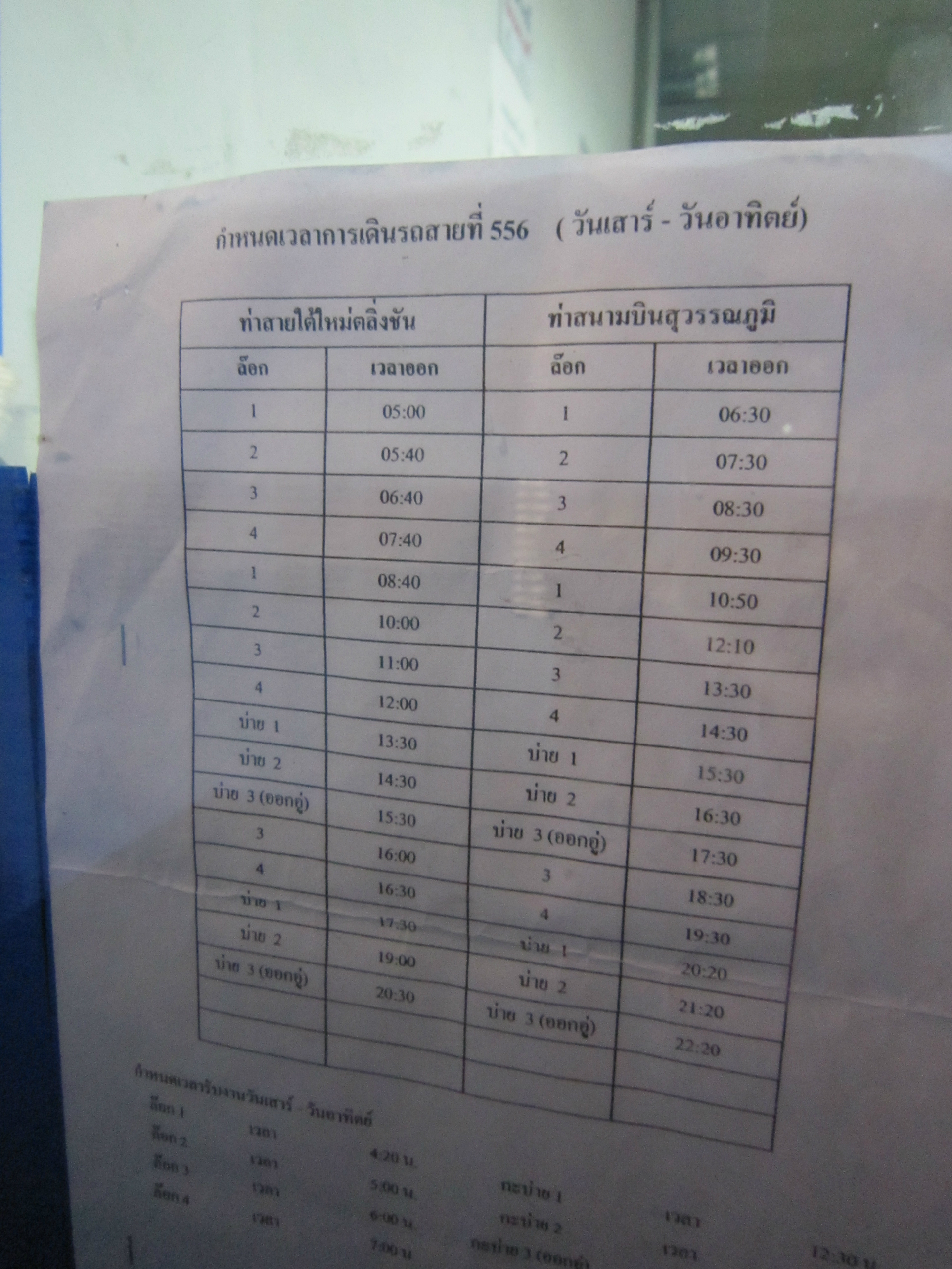 找到住的地方,就要解决另一个大难题,查清始发车的时间。我们辛苦睡在机场就为了找点到水上 市场,所以务必乘上第一班车。官网上说24小时运营,抵达机场后就确认公交情况。问了一大圈,曼古机场的英语水平倒是还可以,但是所有工作人员对机场公共交通中心的情况的理解可以说为零。前辈攻略里提到的汽车时刻表根本就没有。问了好多人,终于得知那里的公交车不是24小时运营的;始发车时间有人说是4点,有人说是5点;至于多长时间一班,只有一个人很确信地说是半小时。至于机场去交通中心,乘shutter bus就可以。抵达大厅随便出哪个门都有站点。大约10分钟一班。行程10分钟。有了这些信息总算安心了,就枕着行李睡了。