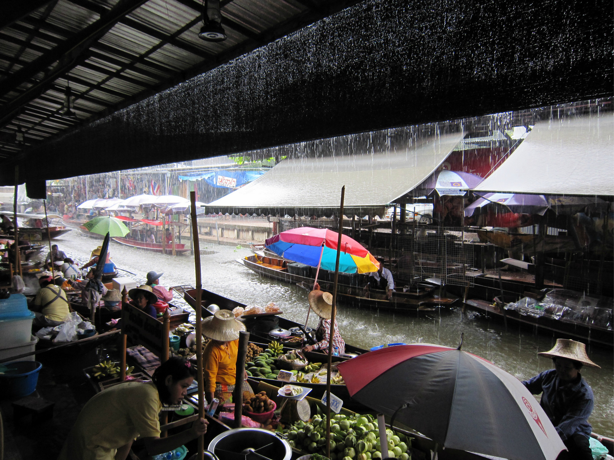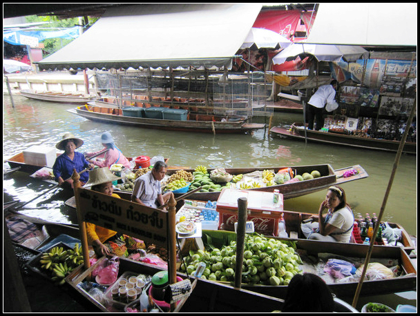 丹嫩沙朵水上 集市(Damnem Saduak Floating Market)在曼谷 西南,距市区80公里的拉差汶里弄府。集市达到高峰期时最为热闹,如果此时你游览集市,泛舟街巷,小商船和载客的小船在运河上会造成河道交通堵塞,形成一道热闹的风景。集市中,一条条载有蔬菜水果等货物的小船,在两岸有茂盛热带树木的运河裏交错往来,船上,劳动妇女们戴著独特的草帽,坐在满载水果、蔬菜和鲜花的小船上,穿梭於狭窄的水道中,大声地吆喝叫卖,小河两岸有栉次鳞比的商店,出售各种特产和精美纪念品,还有一家家临水面而居的水乡居民住宅,构成了一幅令人深感亲切而又典型的曼谷 印象图卷。