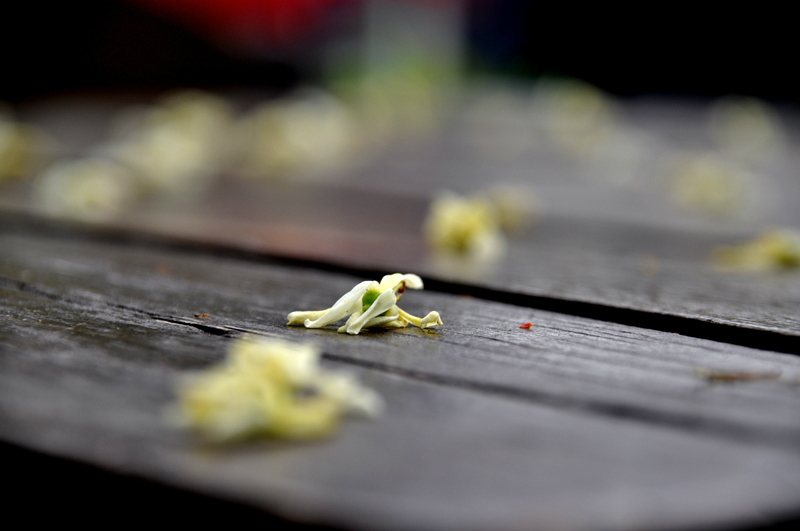 @自助餐门口木桌上掉落的小花,俗称“残花”