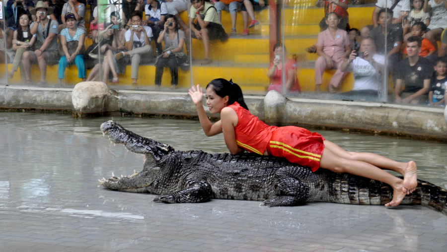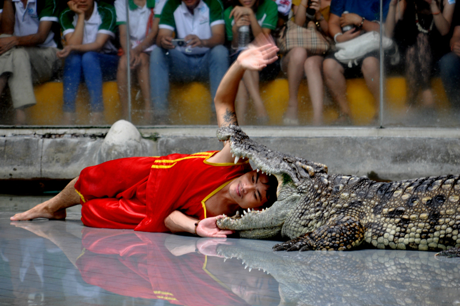 @动物园里的鳄鱼表演。据导游讲,也发生过意外情况,有个表演的小伙子被鳄鱼咬到了手臂。