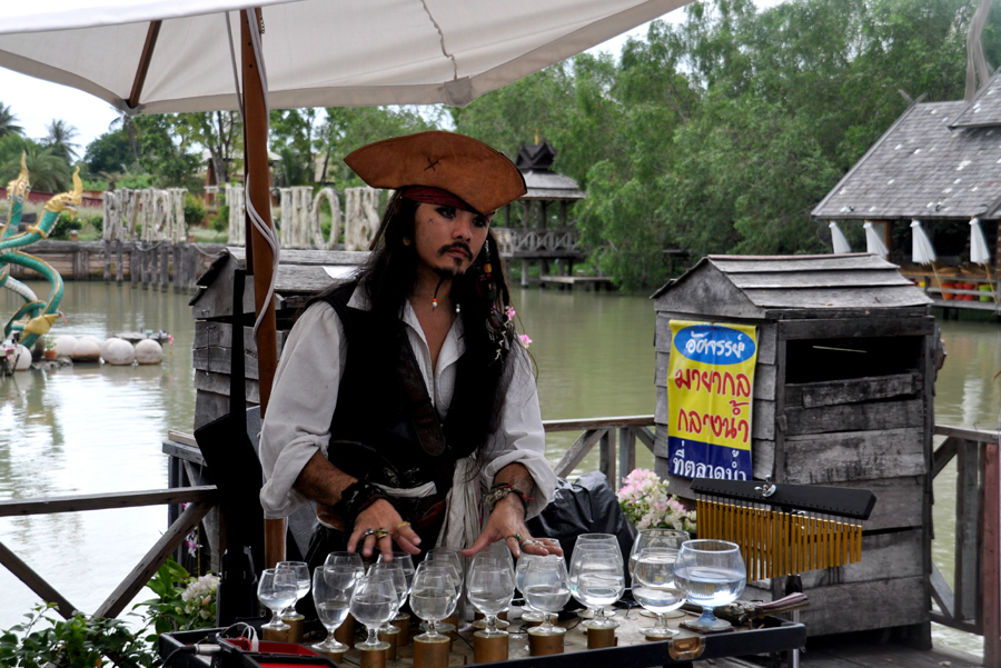 @水上 市场门口的表演者。触摸杯子可以奏乐,但是,不让别人摸。有可能是配的音。