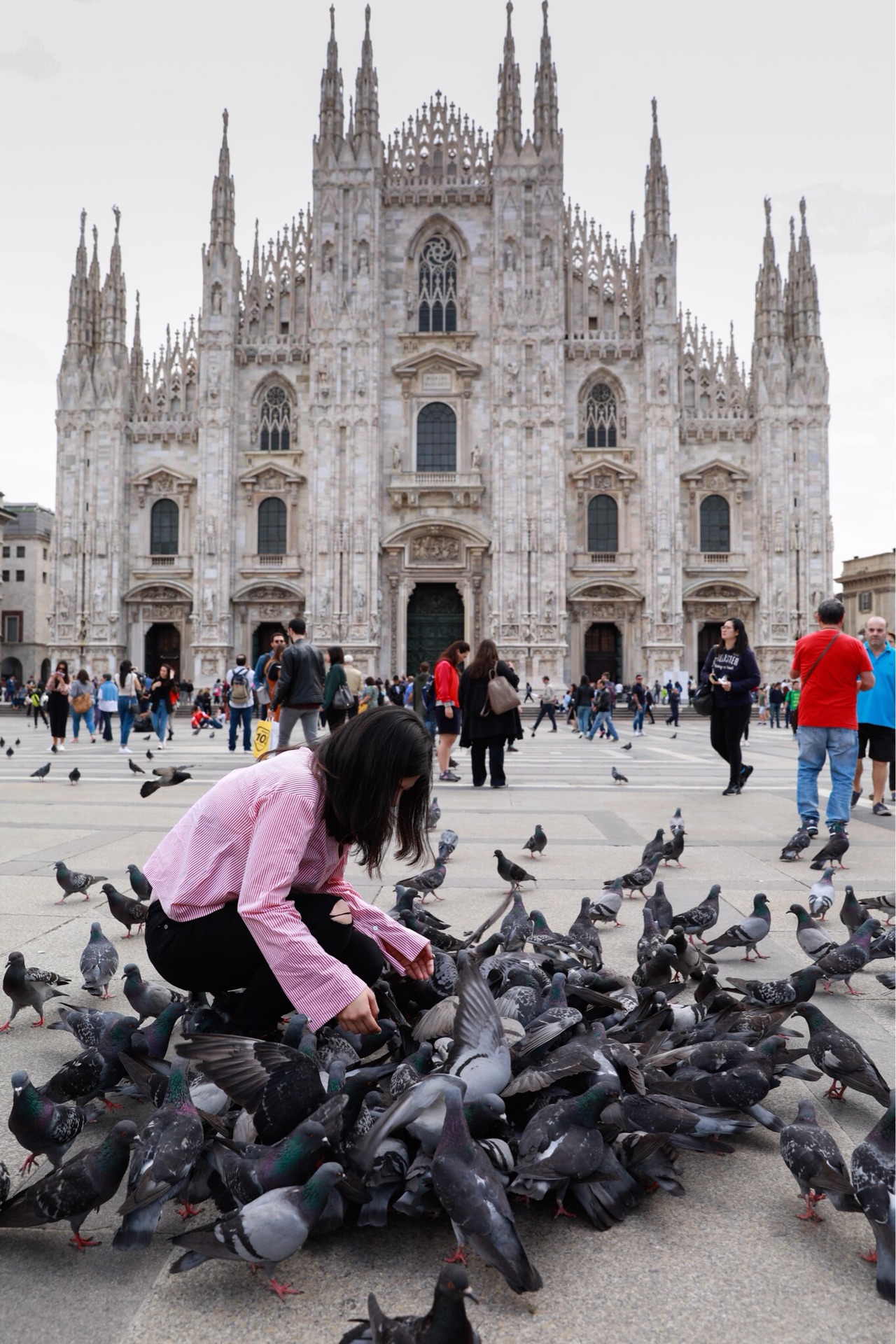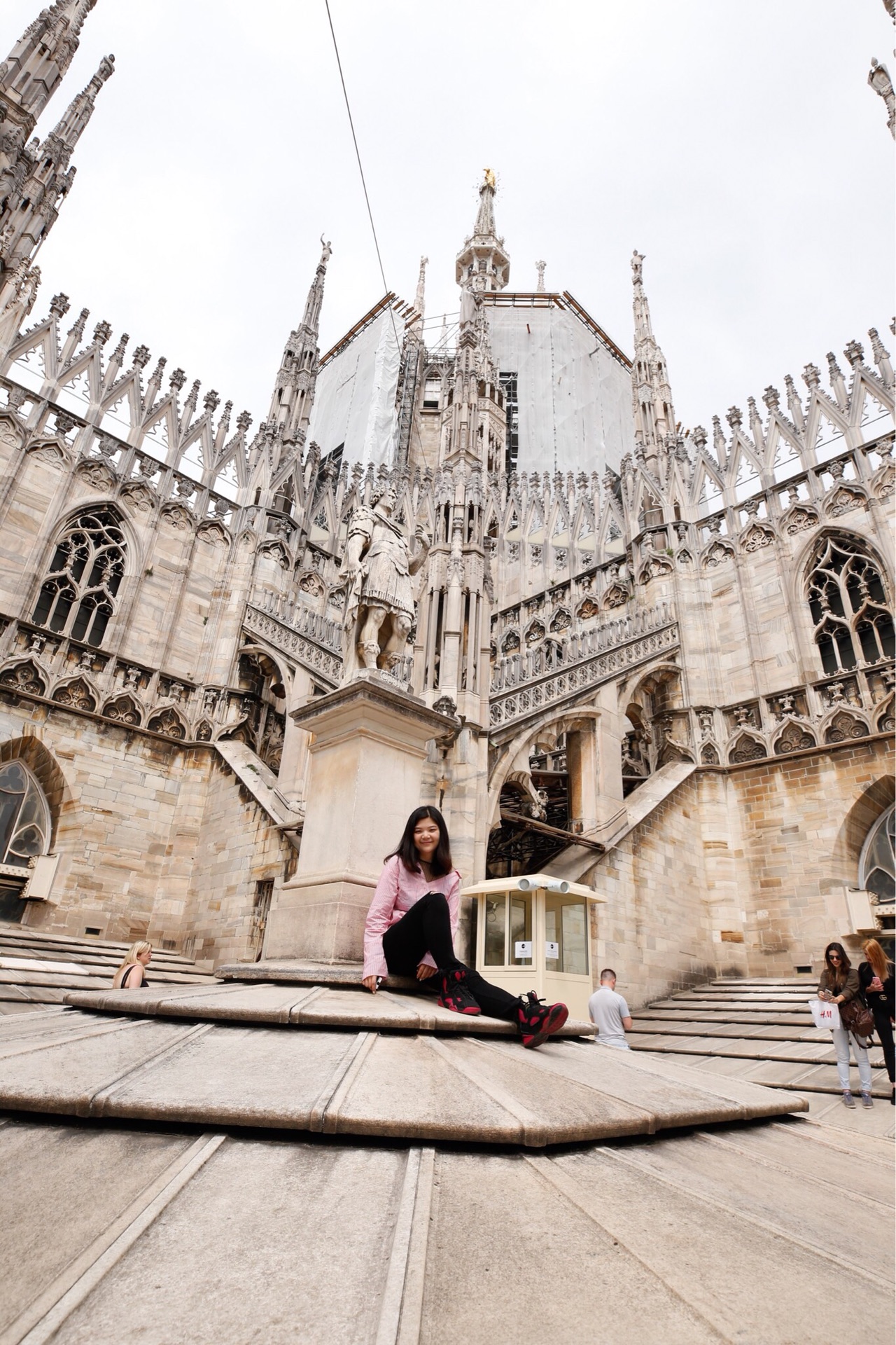 本来想穿着裙子在米兰教堂照相的,结果一下飞机就冻傻了,那边早上是19度,但是中午就变28度,温差很大,我早上受不了,就在洗手间把衣服换了,要是五月去的小伙伴,提前查好温度。我坐大巴到中央火车站后,就把行李寄存了,把一切安排妥当之后,终于正式开启了我意大利之旅。第一站出发去米兰教堂,是我一直很想来的地方,但是这次的时间比较紧,所以一层里面没有参观,只登教堂顶了,在面朝教堂正门的右手边,有网红博物馆,小红书很火的那个,但是也要排队买门票,所以就舍弃了,挨着这个博物馆的地方就是卖门票的地方,先进门拿号,听叫号买门票,门票是可以分进教堂参观加登顶,票价15欧,还有就是直接登顶,因为人很多,所以直接登顶,直接登顶的票也分坐电梯还是爬楼梯,我们选择了爬楼梯,票价9欧,电梯的好像11欧。在米兰教堂拍了很多我喜欢的照片,在教堂前面喂鸽子照相,要5欧,因为都是黑人垄断了,从他们手里买鸽子食。还好小哥哥帮忙,要不就多付5欧。