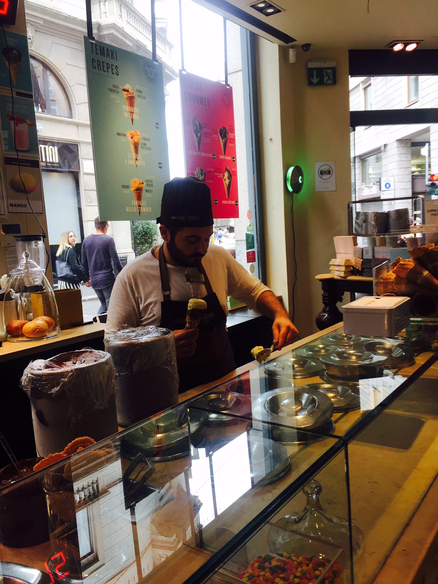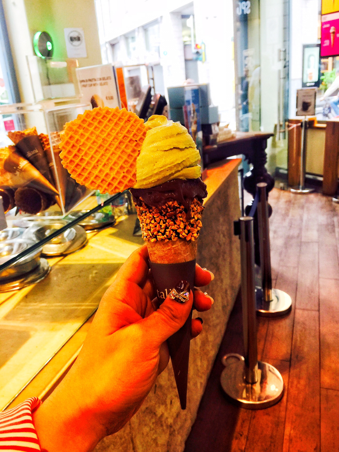 米兰教堂左边就是埃马努埃莱二世长廊,米兰的景点相对比较集中,这个长廊是当地著名的商业街,有着很多奢侈品的限量款,很遗憾因为没有时间,还是没逛成,比较适合照相,时尚海报大片的感觉。这里除了奢侈品还有一家很有名的冰淇淋店,这里这家最正宗。CIOCCOLATTALIANI这家店的冰淇淋很多种,小哥哥说开心果味在当地很流行,我以为是抹茶呢,绿色的,然后尝试了一下,结果停不下来了,要了一个巧克力球,一个开心果球,真的是特别好吃,都说意大利的冰淇淋是脂肪含量低的低卡食物,但是还是挺甜的。也不知道谁和我说意大利食物不长肉,我回来真的胖了,可能太好吃了。两个球这家的算我在意大利吃的比较贵的一家,4.5欧。但是真的好吃。