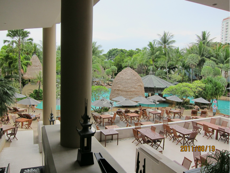 大堂(在二楼)望去的游泳池,楼下就是餐厅