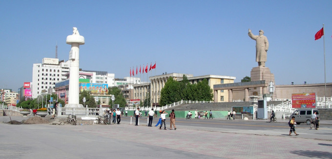 喀什市中心的人民广场上,矗立着一尊高大的“毛挥手我前进”塑像,是喀什街头的标志性建筑。