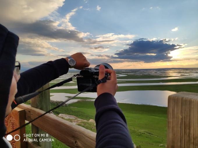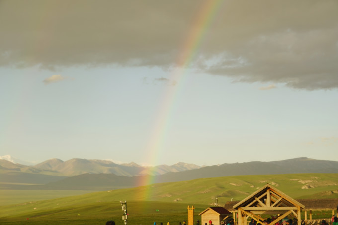 为了观赏巴音布鲁克的九曲十八弯落日奇景,我们于晚上10点钟登上观景台(此时间为新疆落日时间)。巴音布鲁克气候多变,山上聚云成雨,天气骤变,为了观景也是拼了。多亏了陈健师傅经验十足,举头观云,告诉我们不要放弃,于是我们等到了双彩虹和完美的巴英布鲁克落日。