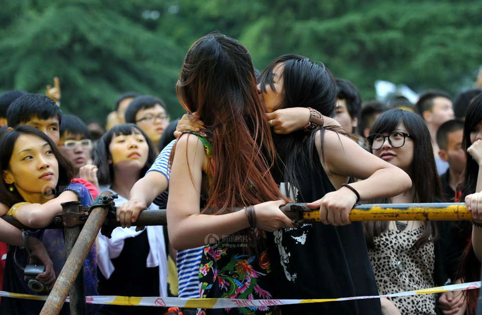 崔健演出邀请女粉丝上台一起互动表演,二十多名女粉丝相继冲上台,一曲结束,崔健被女粉丝强行拥吻。
