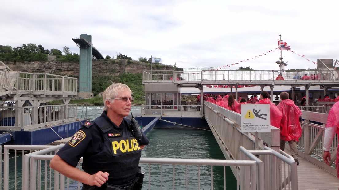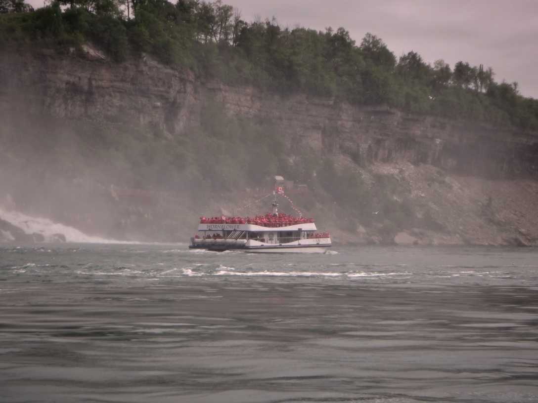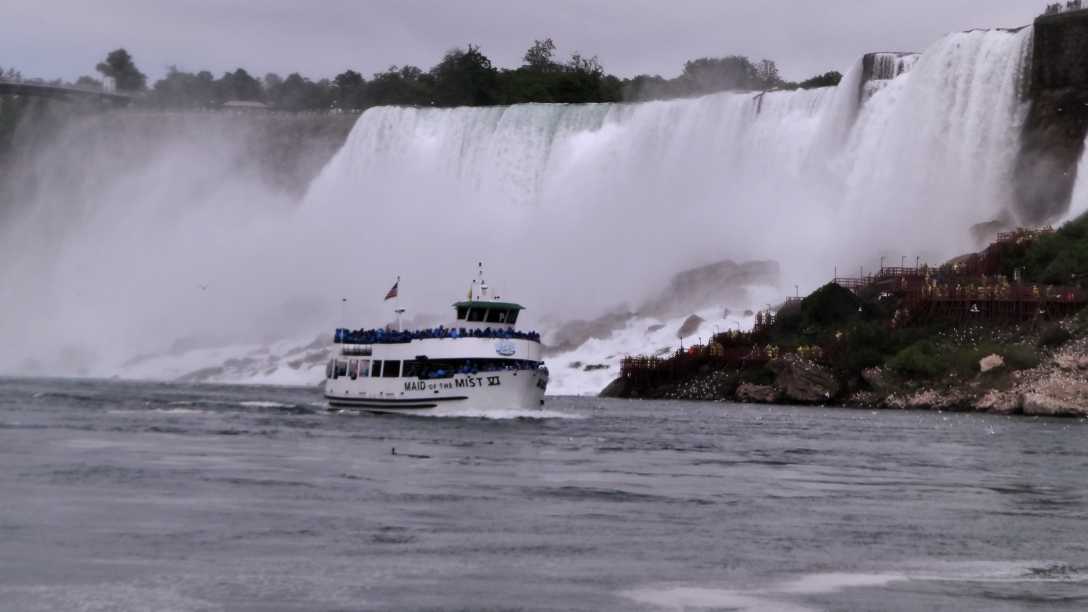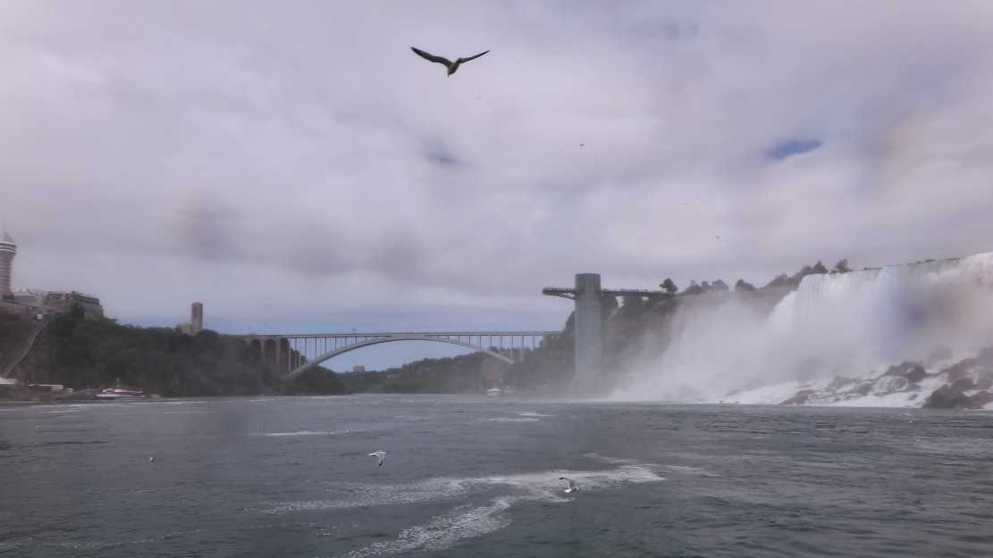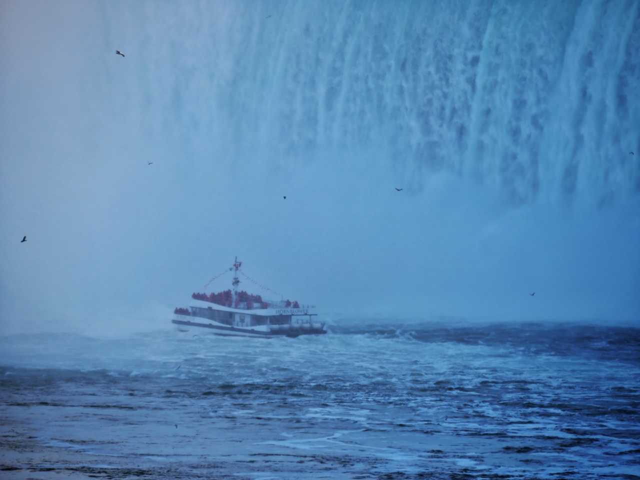美加两国共享尼亚加拉瀑布资源,两岸分别发船载客游览大瀑布。不同颜色的雨衣区分两大游船阵营,蓝色——美国、红色——加拿大,与洁白的瀑布、湛蓝的河水、横跨两国的大桥、嬉浪的海鸟,共同构成气势恢宏、丰富多彩的尼亚加拉美景。