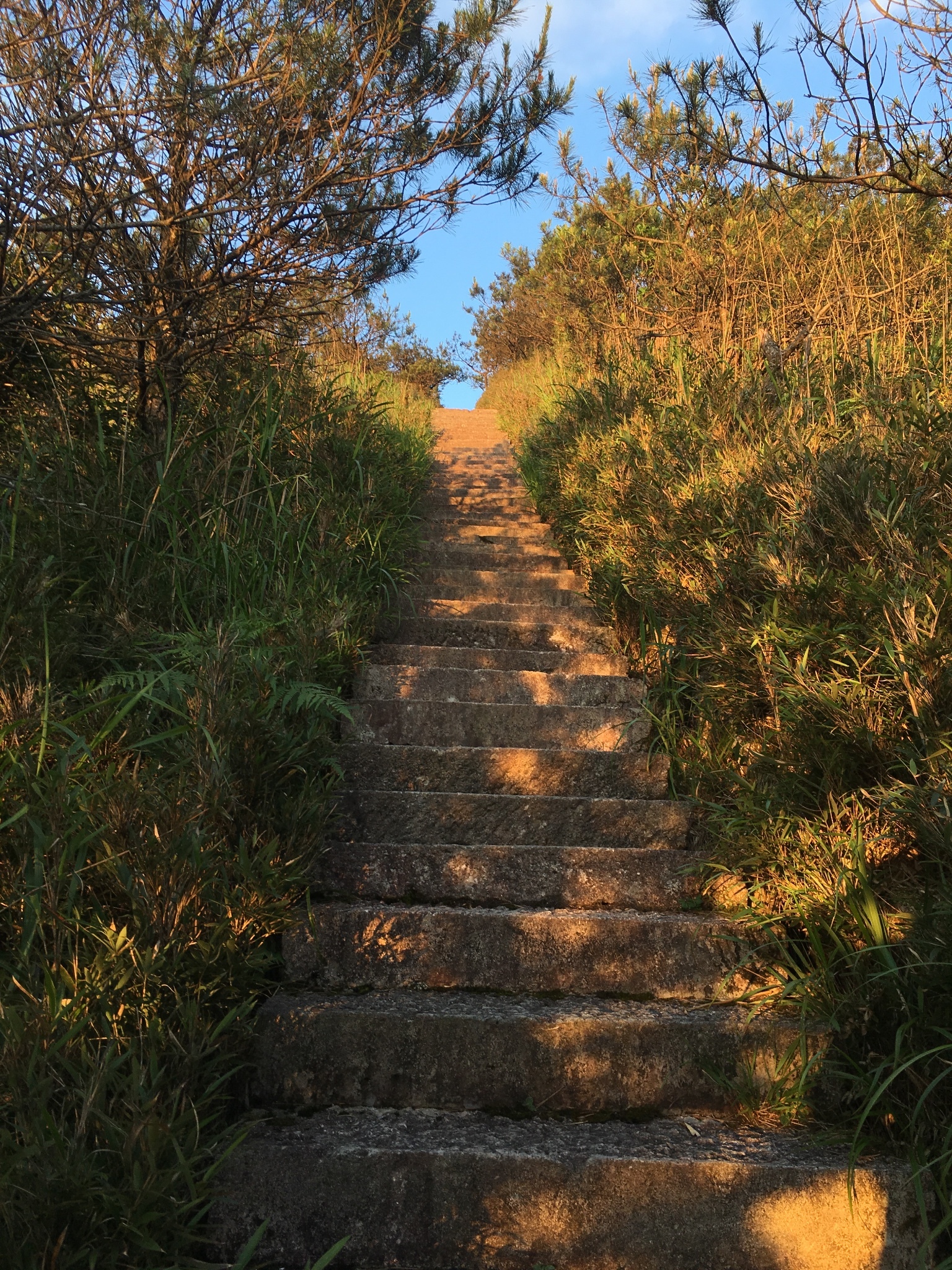 因为特别想爬到最高峰看日落,所以一个人刚开始爬的很快,累了就停下来喘下气,继续爬,爬了一段之后,可能因为还在山脚的树林里走,光线很昏暗,以为已经天黑了,日落是不可能赶上的了,但不知道爬了多久,抬头一看,看到有太阳射进来的光线,瞬间看日落的希望重现,开始和太阳赛跑,每当看到这种看似到顶的路,爬完一段又一段,越爬越绝望