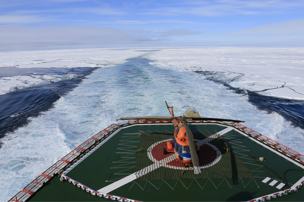 我们在到达北极 点之前,船长把全船的人分成了几组,一组5个人,一起坐直升飞机在空中观察破冰船。直升机在空中绕着破冰船正方向、反方向飞了几圈,让大家看清楚了整个破冰船破冰的过程,这种感觉挺好的,有一种见证的意味。
