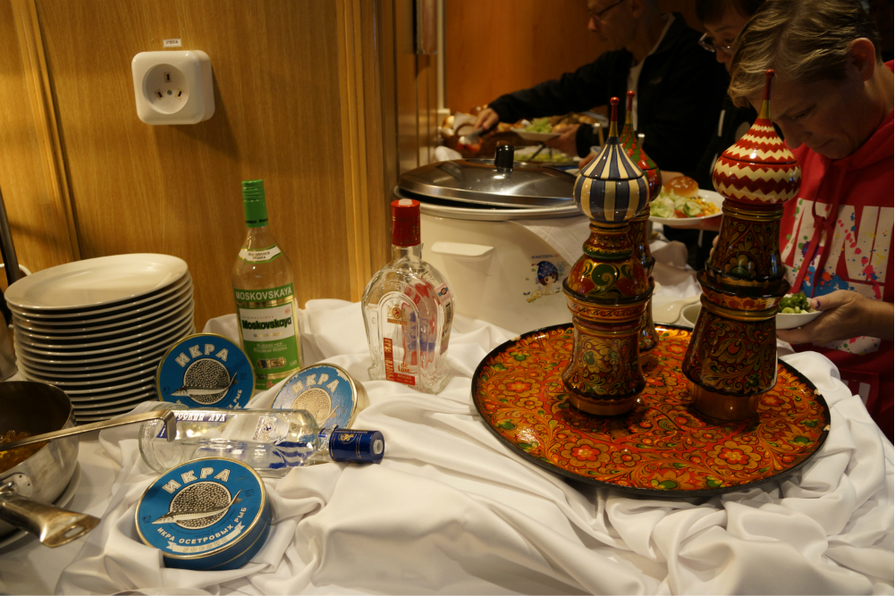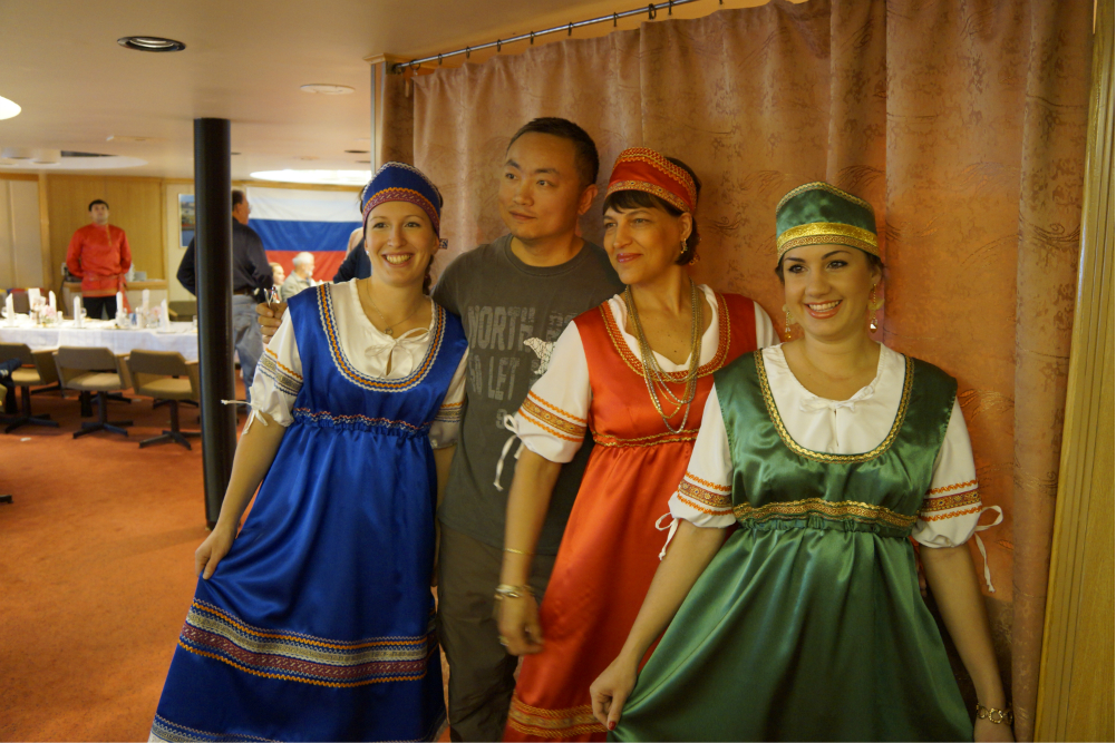虽然这艘船是俄罗斯 建造的,但实际上是被美国 的一个叫夸克的旅游公司给租下来了。所以,我们在船上的行程都是由夸克公司来决定的。不过,夸克公司无法决定船往哪开,这些还是由俄罗斯 船长决定的。除了船长和船员是俄罗斯 人,整个警卫体系也都是俄罗斯 人在控制。