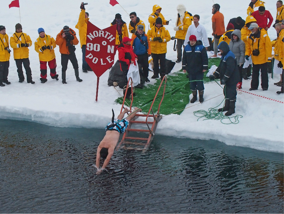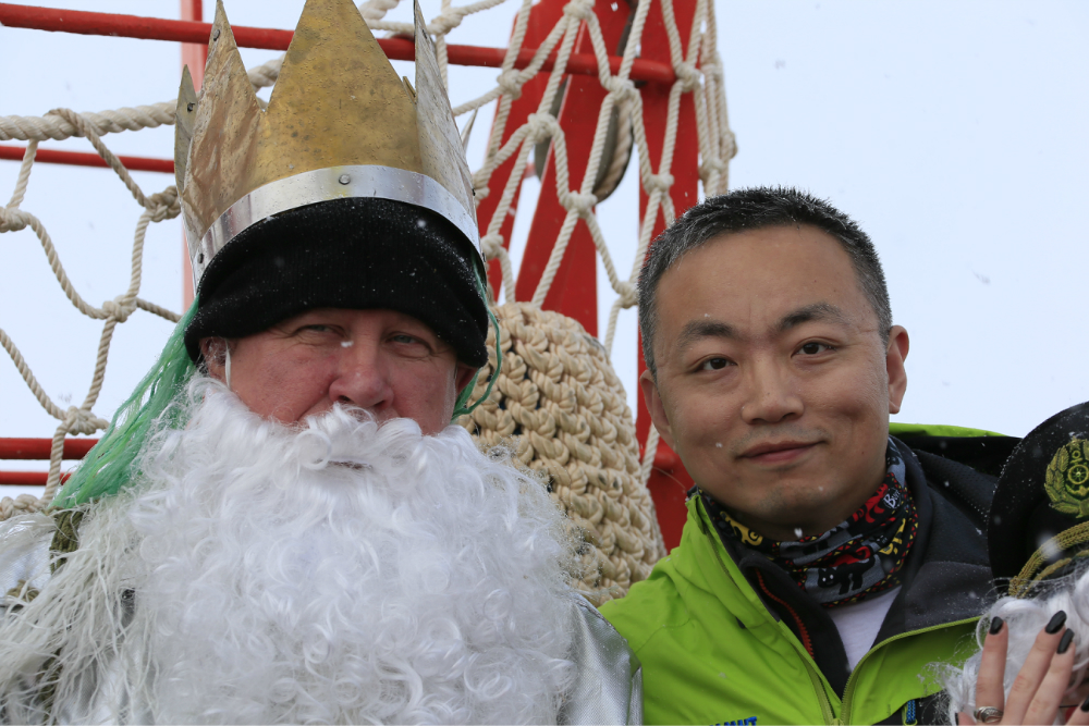 我们到达北极 点之后,船上举办了一个活动,船员把船长打扮成北极 之神,然后进行一个仪式,大家请求北极 之神,允许我们进入北极 。北极 之神同意以后就会给船长一把钥匙,这就意味着同意我们进入北极 了。同时,在前甲板上有一个鸡尾酒Party,大家听到北极 之神说“欢迎你们进入北极 ”后就开始各种庆祝。