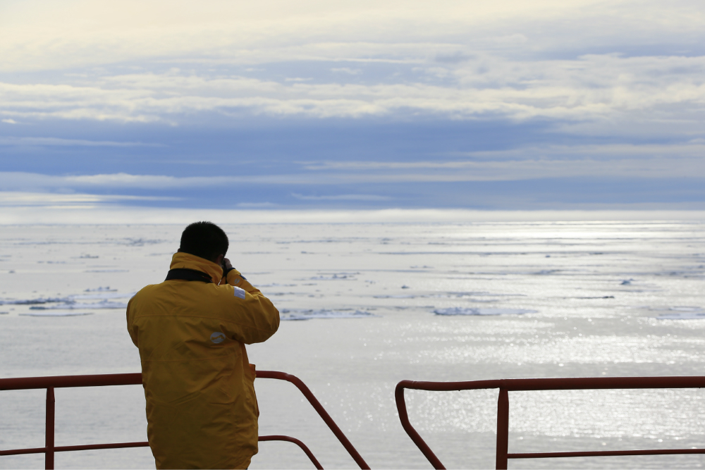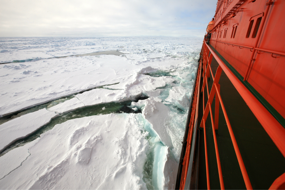 带领我们进入北极 的是一艘核动力破冰船,刚开始离开俄罗斯 的时候,是从摩尔曼斯克 往北走,大概头两天的时候看到的全是海,从第三天开始就基本全是冰了。