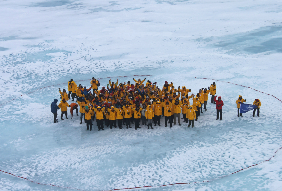 Party结束后大概一两个小时船会继续前进,当它找到一个可以让大家下船的地点时,就会停船抛锚,然后有专门的船员先下去搭台大家下船自由活动。这是我在直升机里俯拍的一张大家的合影,当时,全船的人围成了一个圈,一起绕着北极 点走了一圈。