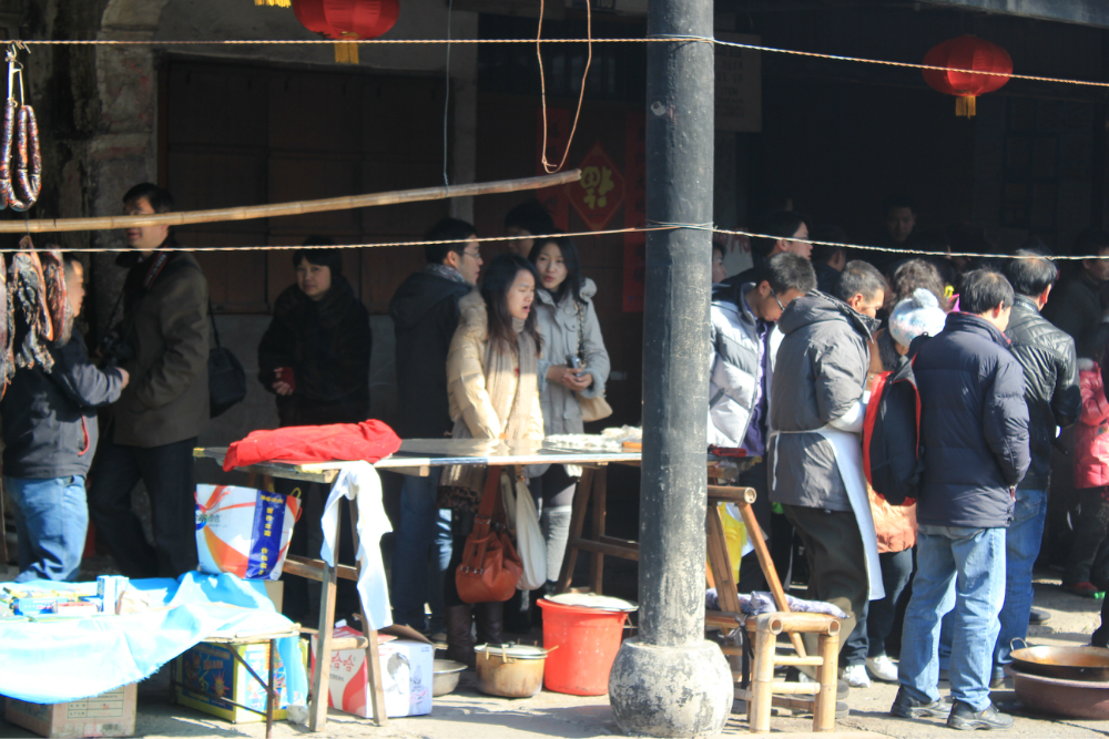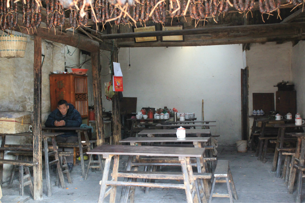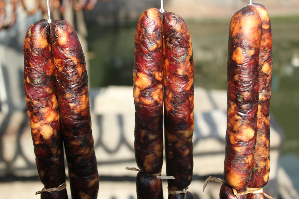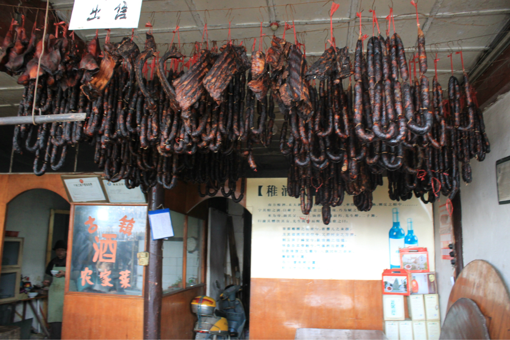 这里几乎每家都有自制的腊鸡腊鸭,自灌的腊肠,黑乎乎的,油光发亮,吊在门梁上风干。。