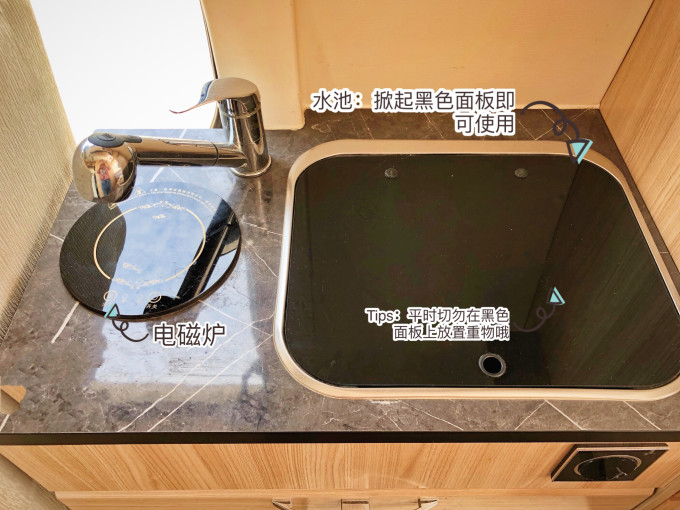 B型房车则空间设计相对紧凑,适合2-3人小家庭短期旅途,但总体从行驶的性能及安全性而言,更推荐B型房车,在市区内通行也更为便捷,空间虽略小于C型房车,但各种吃住做饭洗刷储物等装备都应有尽有, 足以满足基本需求,此次我租赁的就是“B型房车 RV80”款。
