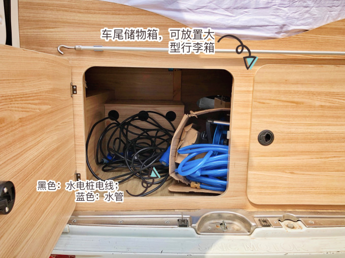 同时还会提供备胎是悬挂在车下、拆卸工具在副驾驶座位下以及户外遮阳棚。