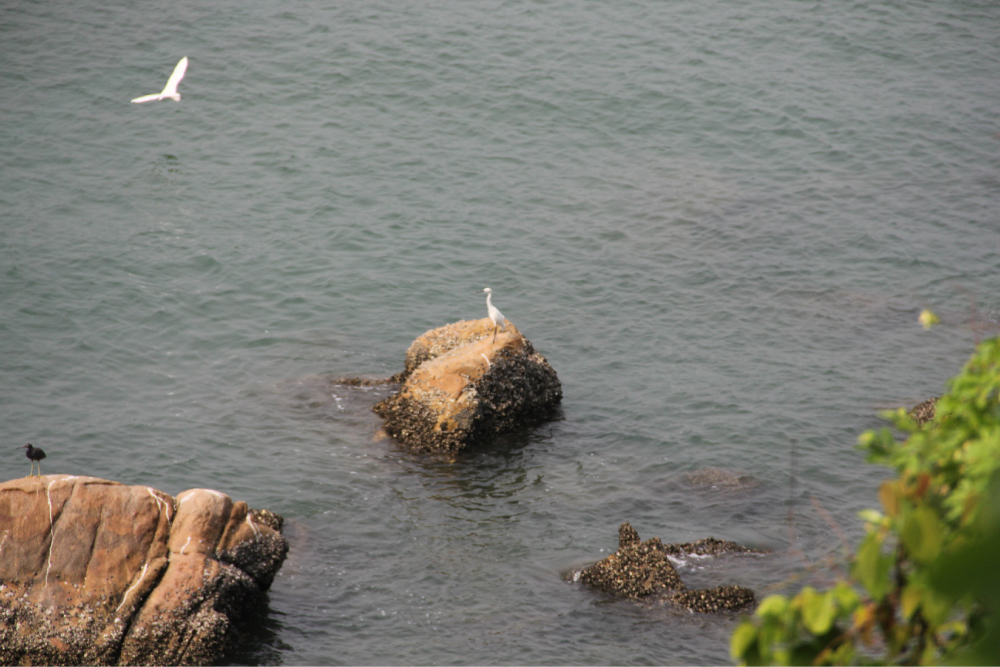 当夕阳落下山头,西面的天空一直红到海面,头顶上空海鸟远鸣,此情此境我不经联想到王勃在《滕王阁序》中写到的“落霞与孤鹜齐飞,秋水共长天一色”。