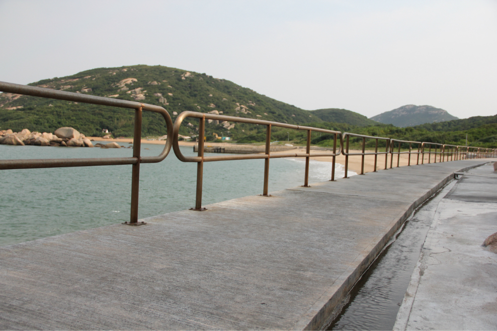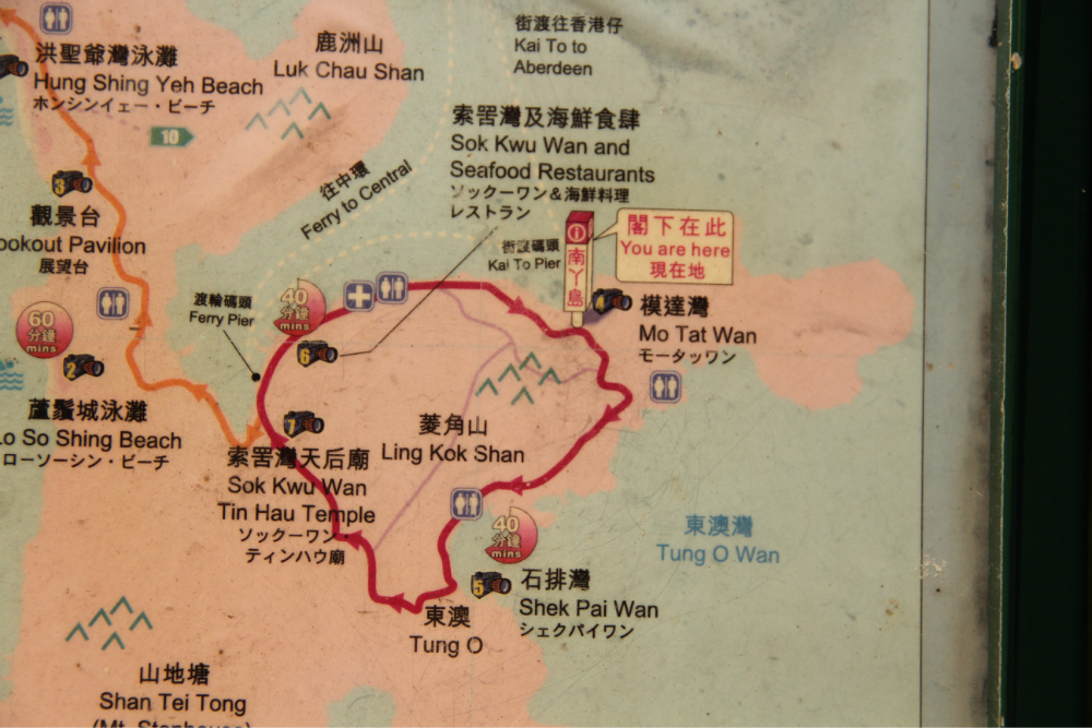 穿过海鲜街市,沿着榕树湾大街继续东行能到的模达湾,并且可以兜一圈回到天王庙。 但是奇怪的是海鲜一条街这边的路牌上标示走这一圈需要2小时,而从此处到Alan来的榕树湾却只有1.5小时,我有点不解,从地图上看这一圈距离不是很远,但居然要两个小时?此时是下午3点,海鲜街市依然门可罗雀,因此我决定对自己狠一点,在吃晚饭前把整个岛最后这一段给走完了。