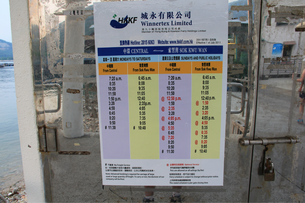 首先,我们先从交通说起,从中环下地铁后从IFC(国际经融中心)穿过去出门过天桥就能看到4号码头。船基本上半小时到1小时一班。(tip1:大家看谷歌地图会发现在南丫岛的南端有个地方叫榕树下,而到了4好码头,开往南丫岛的船就两个方向一个榕树湾,一个(索罟灣) 难道没有开往岛北部的船?有这样疑惑的朋友,Alan再次给大家解释一下,其实榕树湾和榕树下完全是两个地方,榕树湾在岛的北部,而榕树下只是岛上南部非常不起眼的一个小景点,主要是因为google地图把这个小景点莫名突出了)