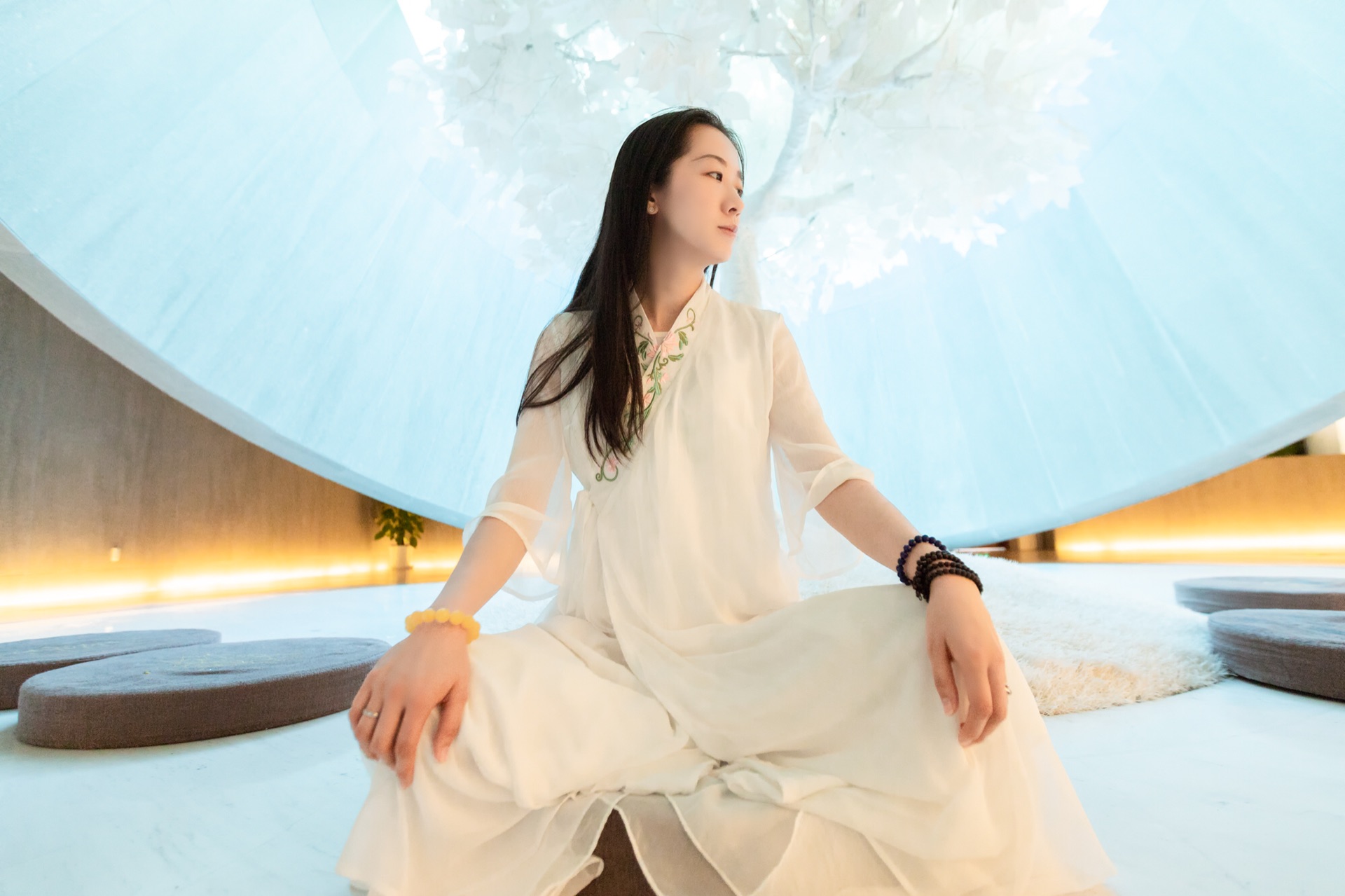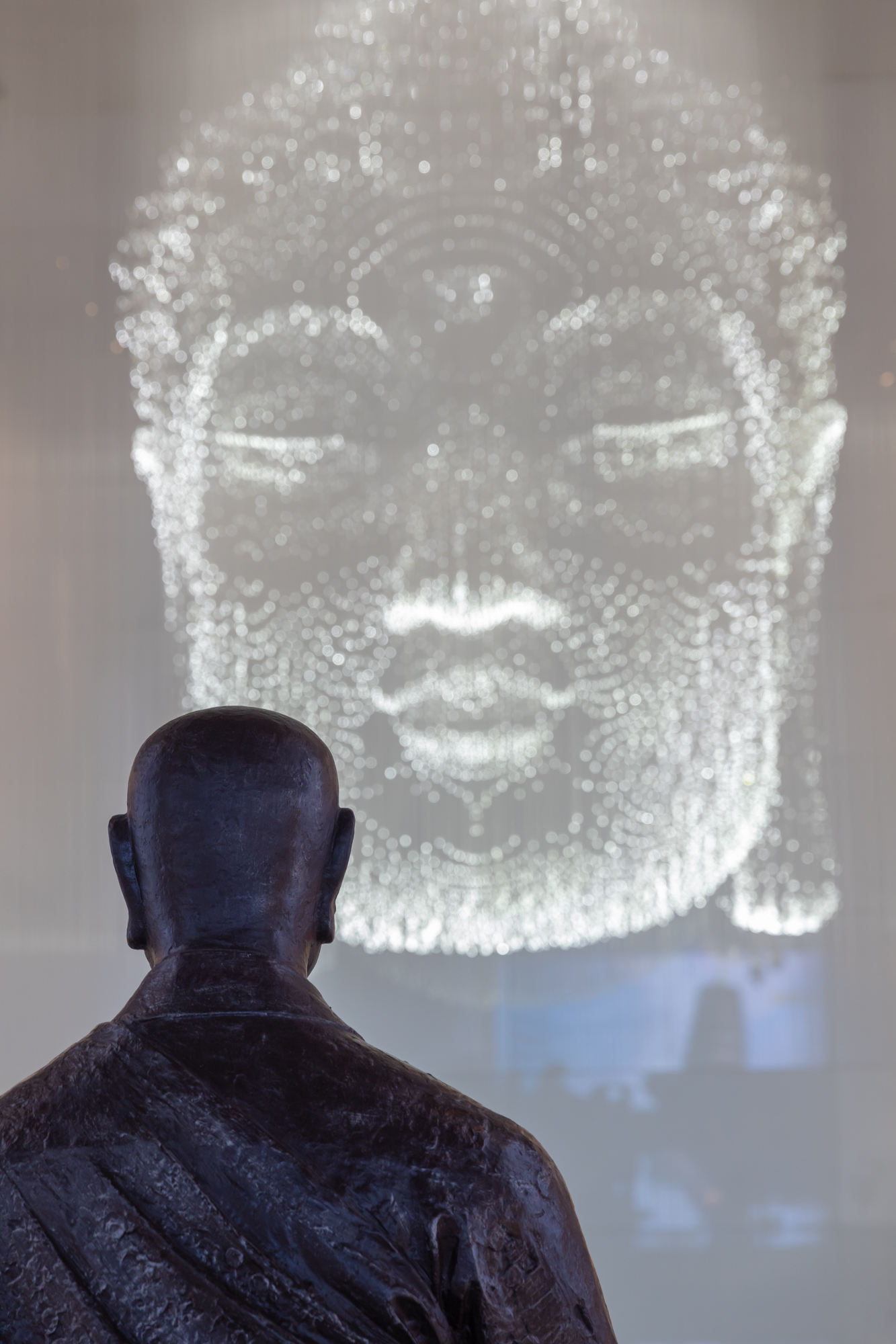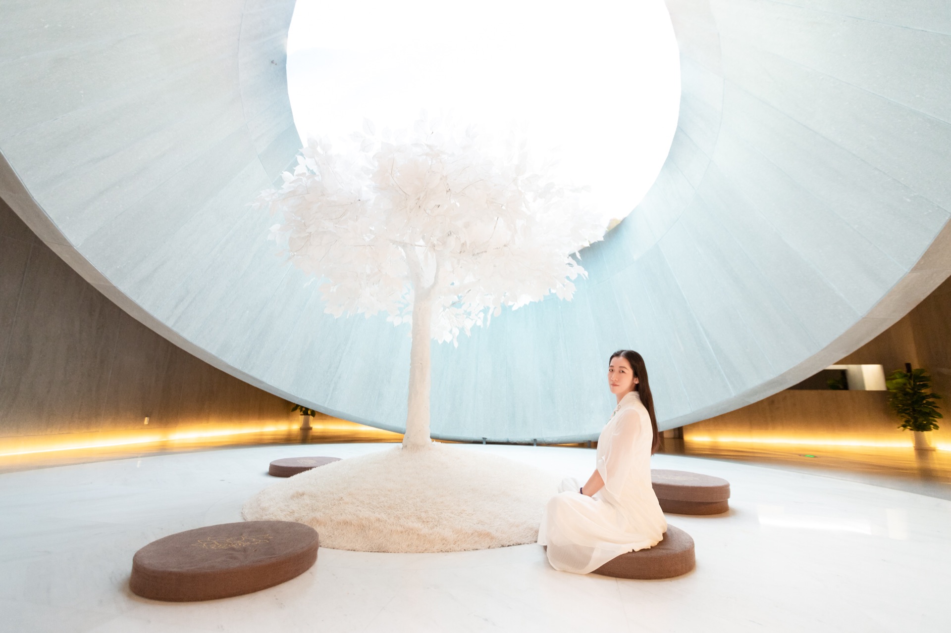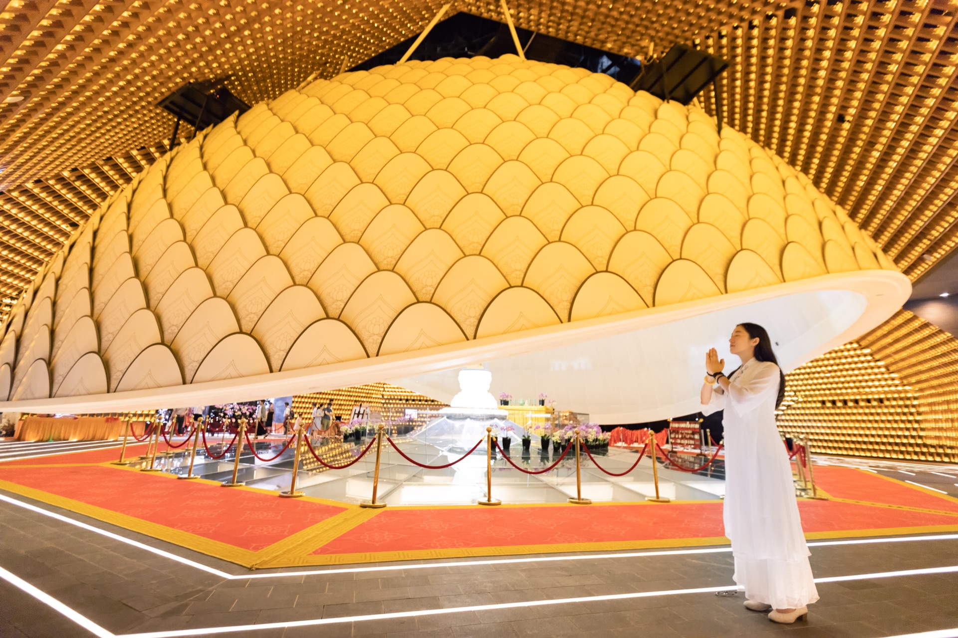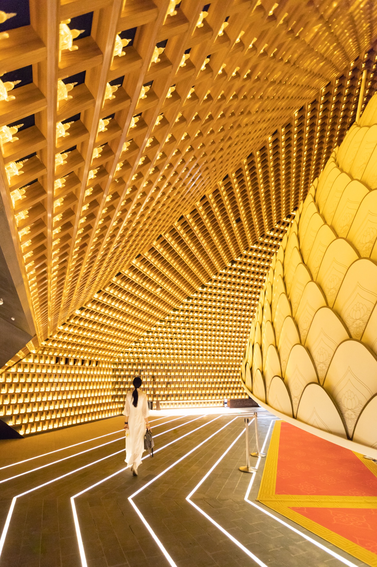 小厨和厨娘为了能有一个清净的环境参观、拍照一大早就赶来大报恩寺。一进来先冲到最喜欢的“感恩众生”展厅。这里的最大特色是上下圆形展台,同时头顶的Led灯会时常变换亮度和图案,能够拍出十分超脱的感觉。