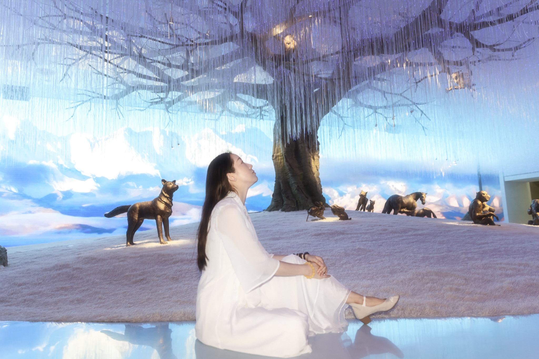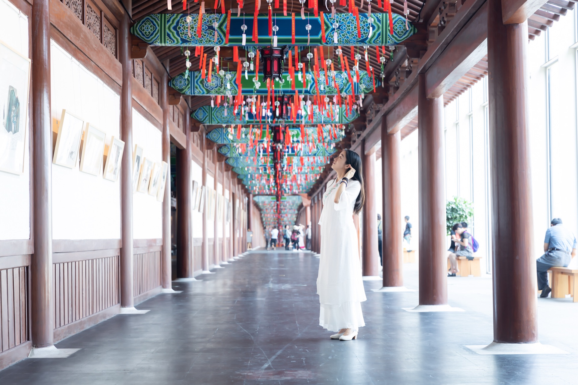 拍完这里,小厨和厨娘倒着往回走,路过一个展厅,万条垂下,灯光迷离。在这里拍一组,很有《三生三世》的感觉