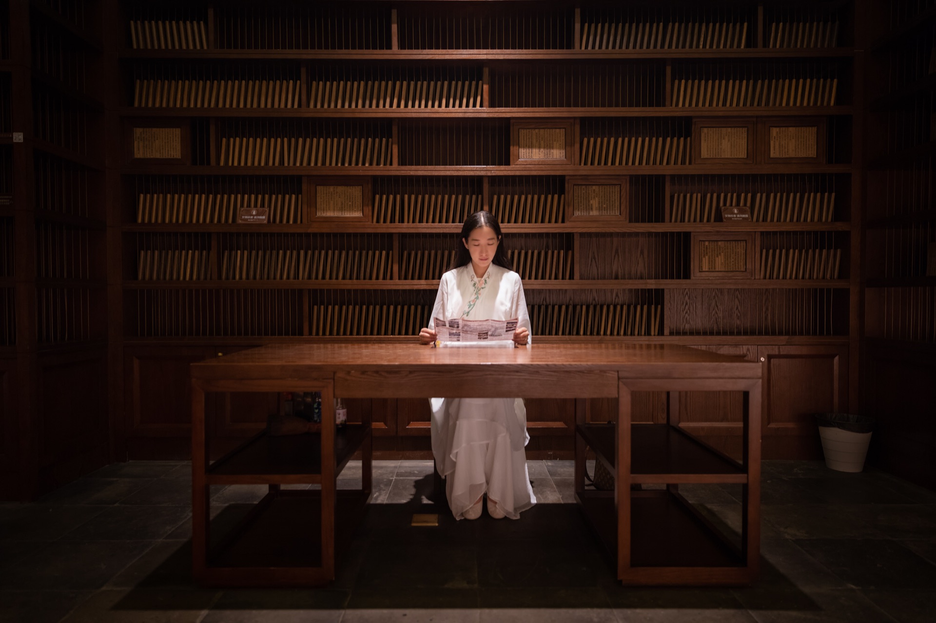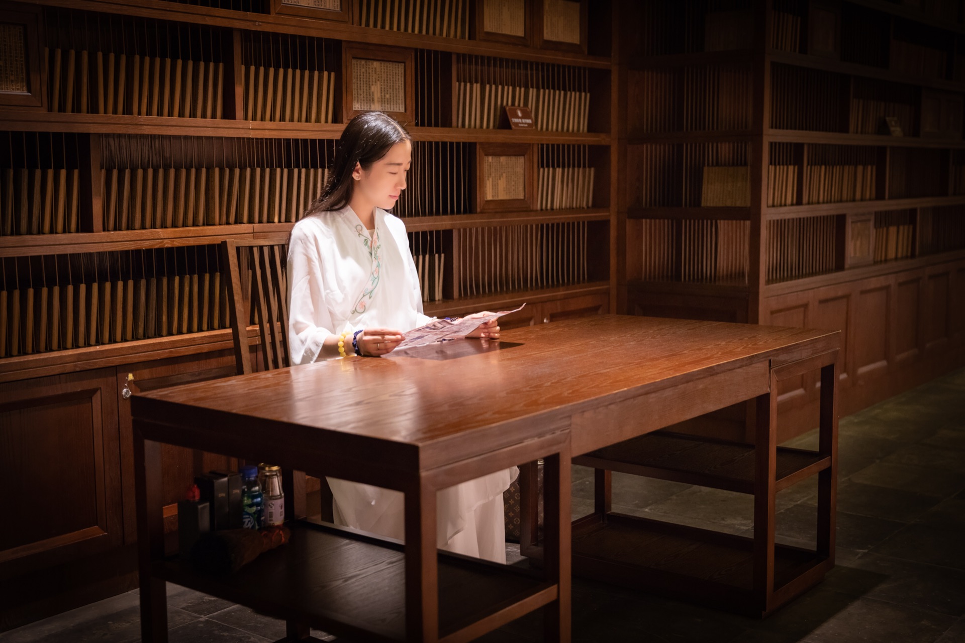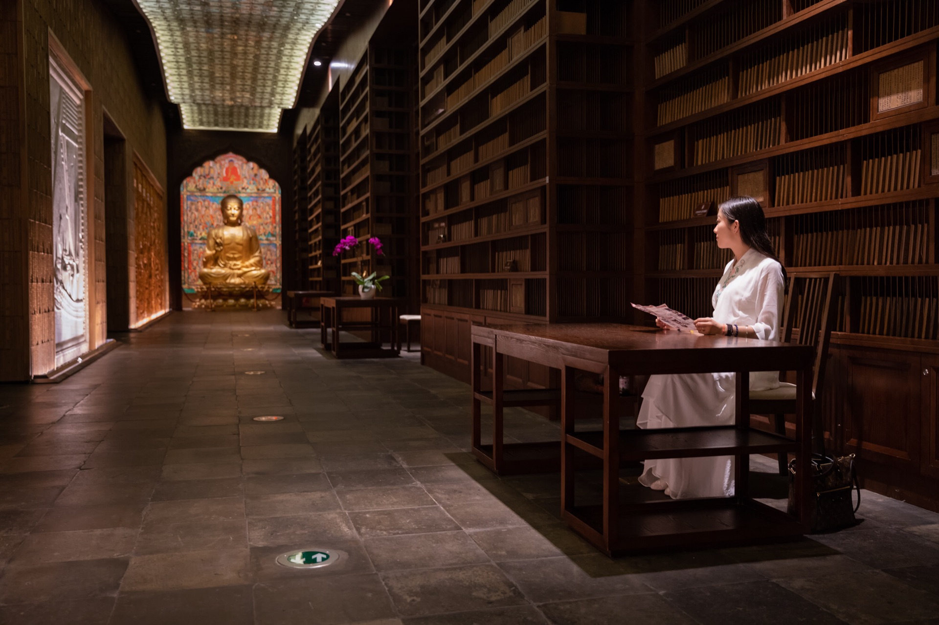 藏经阁内全是实木书架,书码得整整齐齐,让人赏心悦目。感谢保安大爷让我们坐在座位上,好好凹几个造型