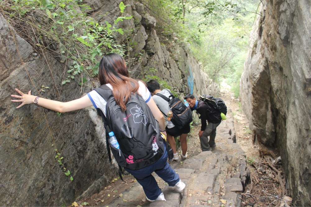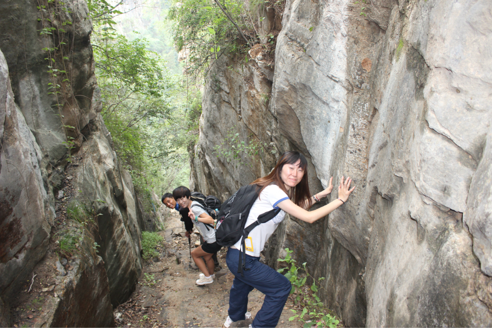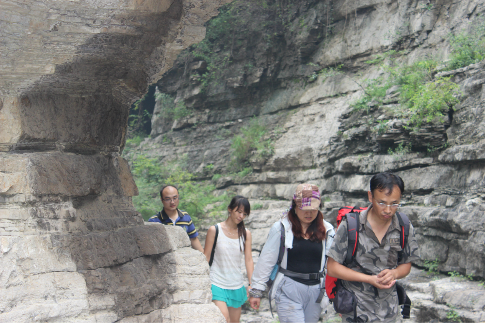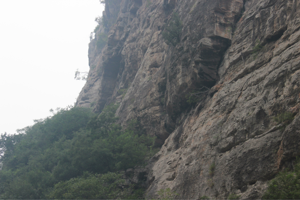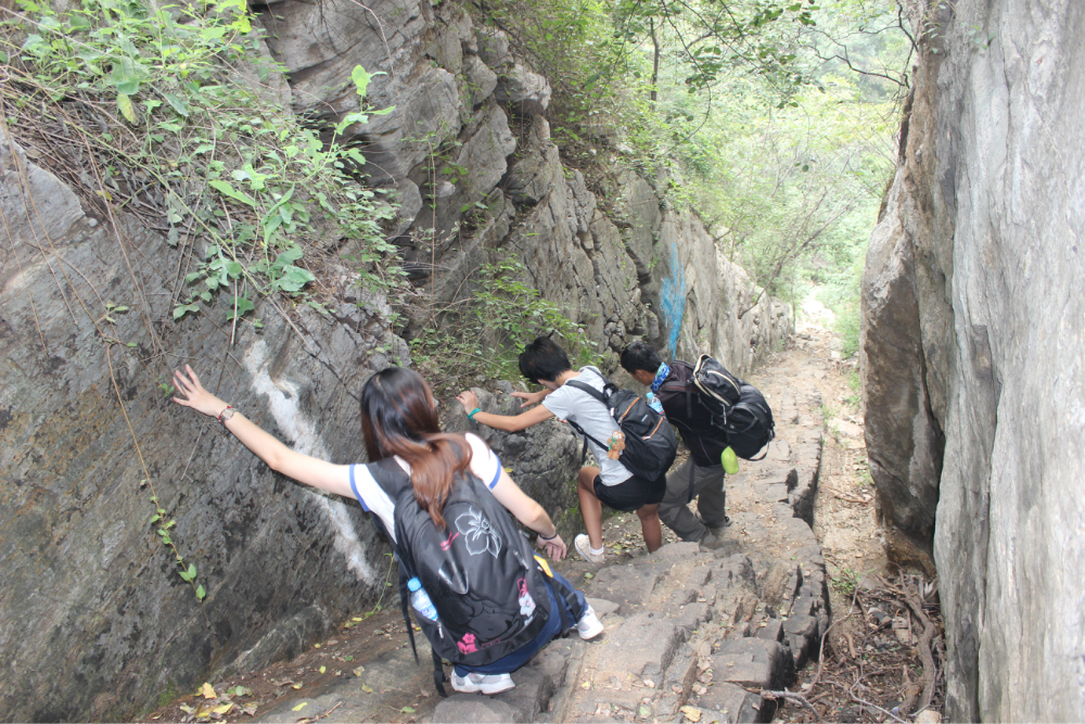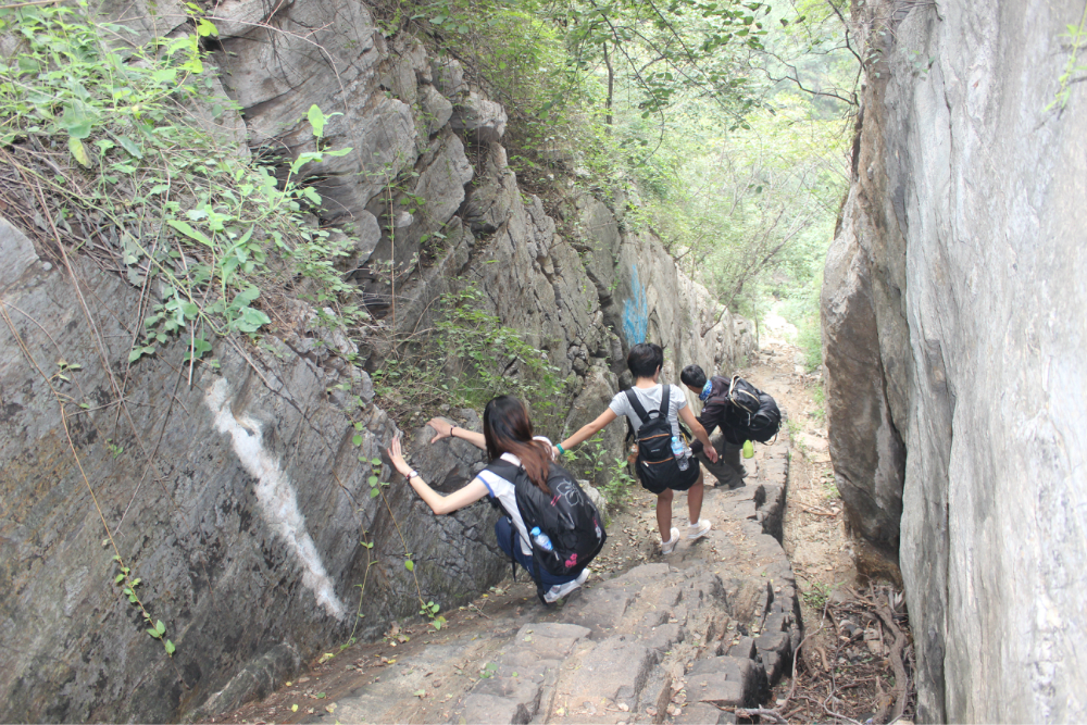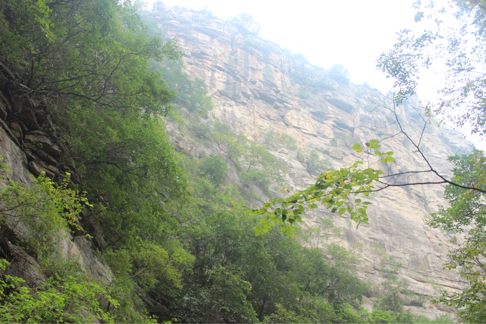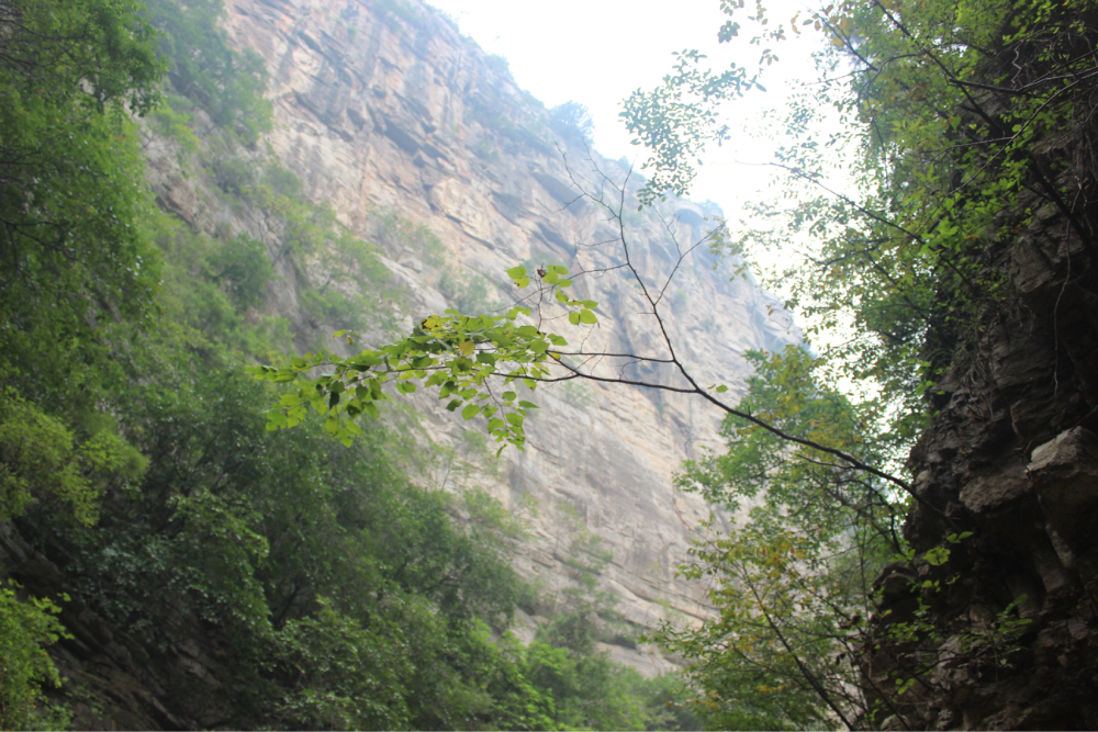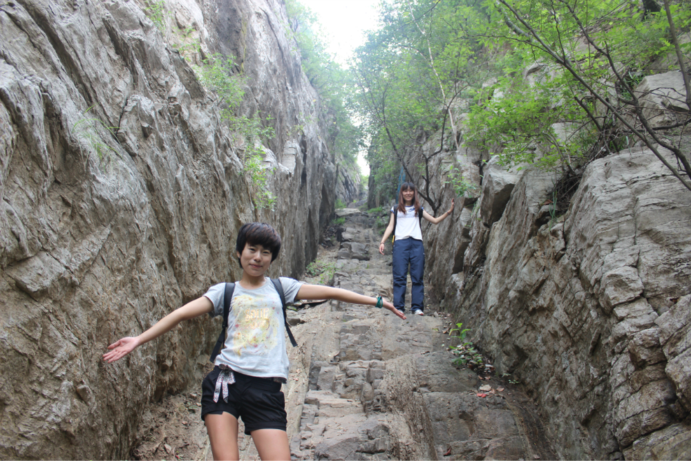 因为我的小佳在公司的抽屉里安睡,我拿着单反冒充了一下,路上有人误认为我是记者暗喜中,绕过繁华绕过尘土,乡间小路蜿蜒直上。一小时到达以第一个山顶,稍作休息来一个苹果酥脆酸甜是我喜欢的口感。虽然未见到阳光下的蓝天却也因为这远离尘嚣的安静而欣喜雀跃。简单休整继续前行,遥远对于藏龙涧的熟悉让我们经历了很多美景,那陡峭的石壁有着北方少见的壮观,那石壁上细微流淌的清水让这山有了灵性。可惜不是桑葚盛产的季节只能在遗憾之后等待来年....一线天,陡峭危险,举步维艰,但是从下向上仰望时却又满是成就感。BOBO笑我说在这样危险的境地还不忘拍照,这种喜爱值得去买一台单反。 在一个宽敞的地方用山涧的清水洗洗满手的污垢,坐着聊聊天。周围是美景,身边是好友,这样的周末是多么的难得,一路上都得到了遥远的照顾,我们三个人一致认为有遥远当领队是一件幸福的事情!碰上驴友简单的招呼一下尽管并不认识却因为共同的兴趣而亲切,路上捡到一个大哥跟随我们的队伍去了一路上广告不断的手擀面店,老板很淳朴热情,我们也跟着遥远沾光得到一大碗珍贵的面汤,珍贵的原因不是因为贵而是因为需要人工挑上山的水所以值得珍惜。我对于面的热衷度取决于厨师的手艺,看着一大碗的面条时有点犹豫怕被浪费然而说说笑笑中已经见底,菜菜跟两位帅哥还对饮一瓶,我在旁边以水代酒聊表敬意。